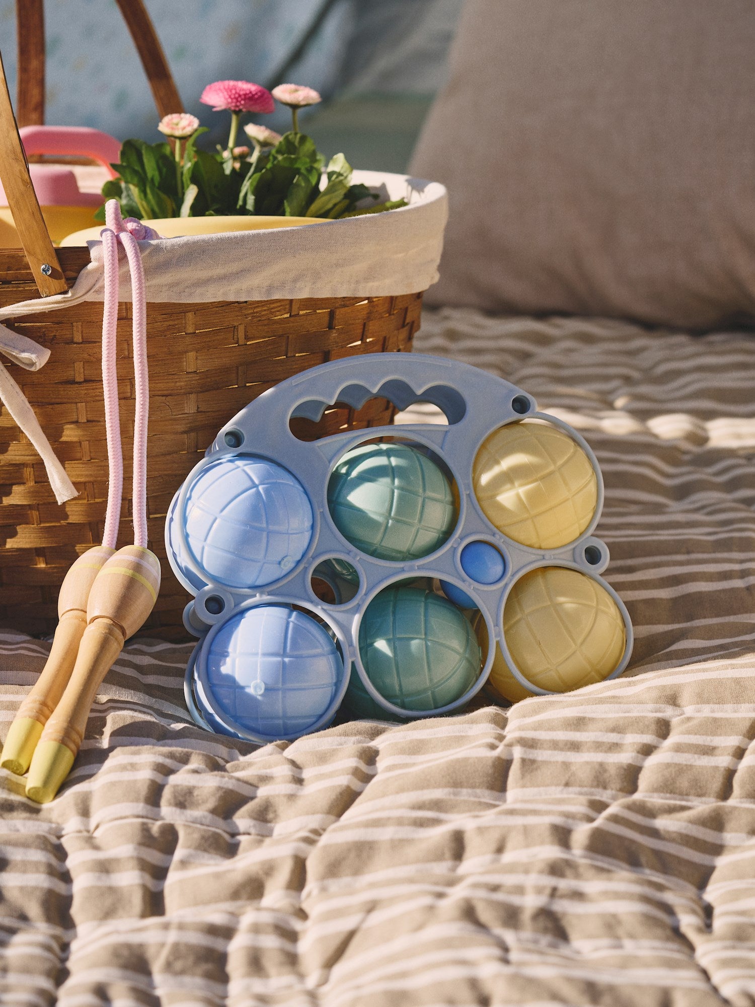 Outdoor games "Shall we roll one more?" Anna suggests. Clara considers the toy petanque set a calm way for the nieces and nephew to take turns outside, and practise aim without fuss.