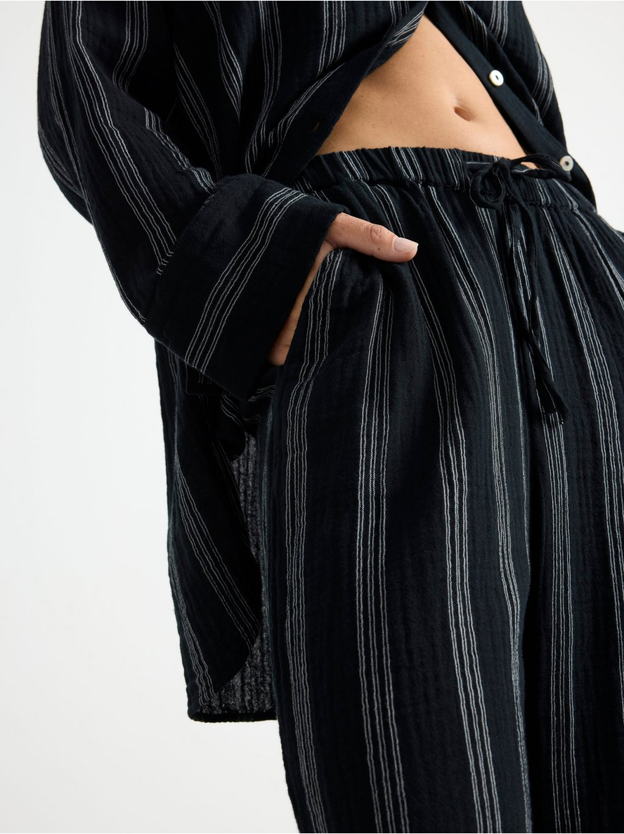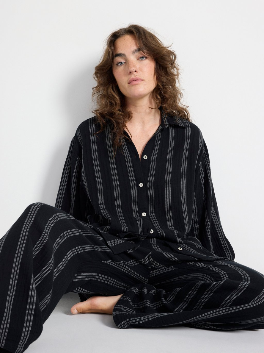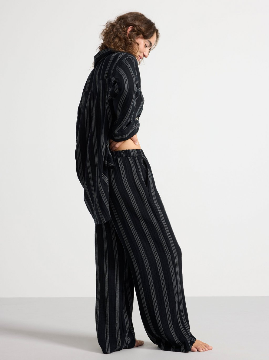 Wide pyjama trousers in cotton gauze fabric with pockets to sides. Contains 85% organic cotton Contains 15% recycled cotton Length: 72 cm in size M 100% bómull