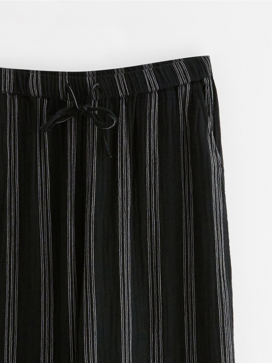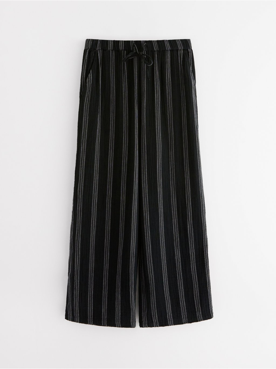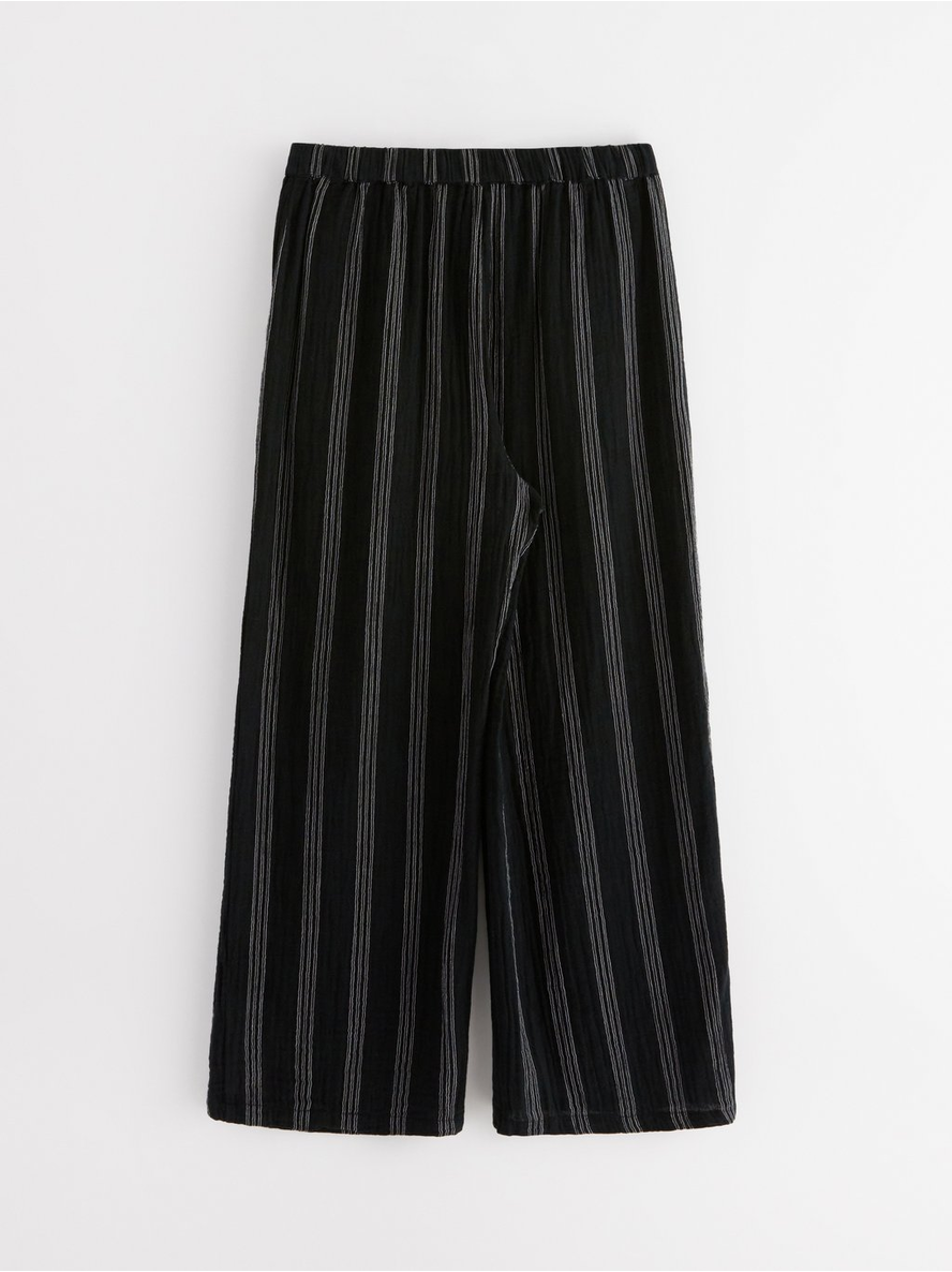 Wide pyjama trousers in cotton gauze fabric with pockets to sides. Contains 85% organic cotton Contains 15% recycled cotton Length: 72 cm in size M 100% bómull