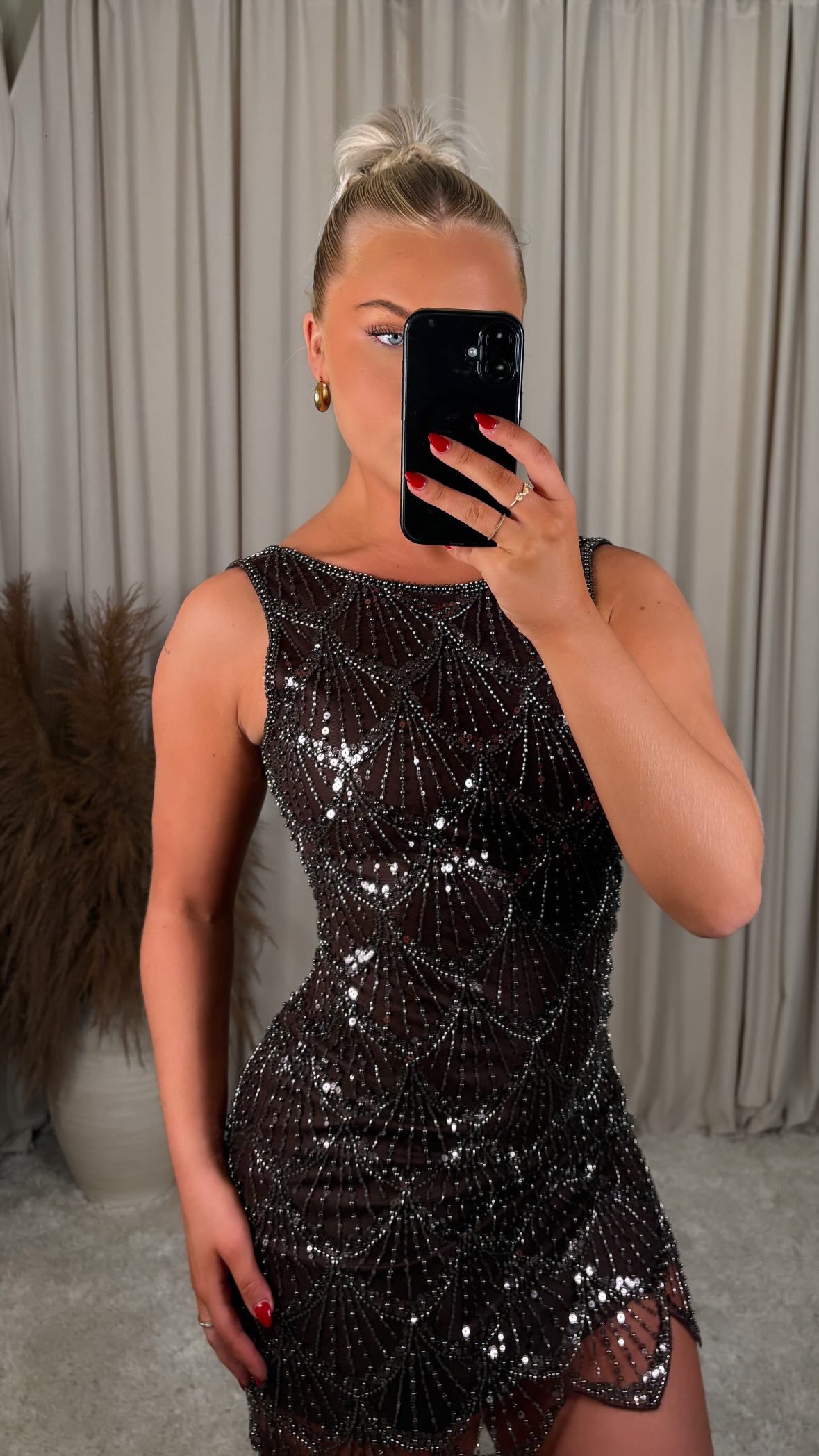Æðislega fallegur pallíettu kjóll úr mjög þæginlegu efni, það er smá teygja í efninu og er með rennilás að aftan  modelið er 168cm og er i stærð S/M