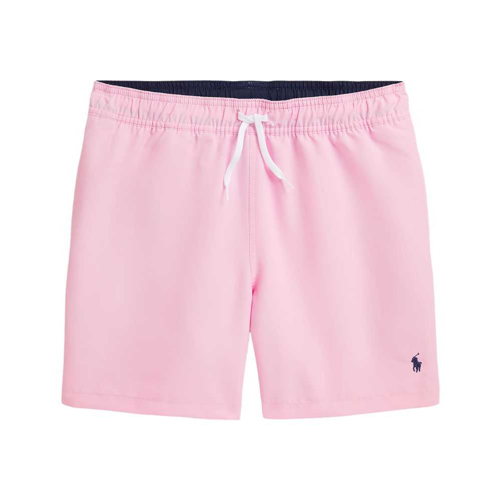 Ljós bleikar sundbuxur frá Polo Ralph Lauren með neti að innan. Sundbuxurnar eru bundnar í mittið með opnum vösum á hliðum og hnepptum rassvasa. Rautt logo á vinstri skálm. 100% polyester.