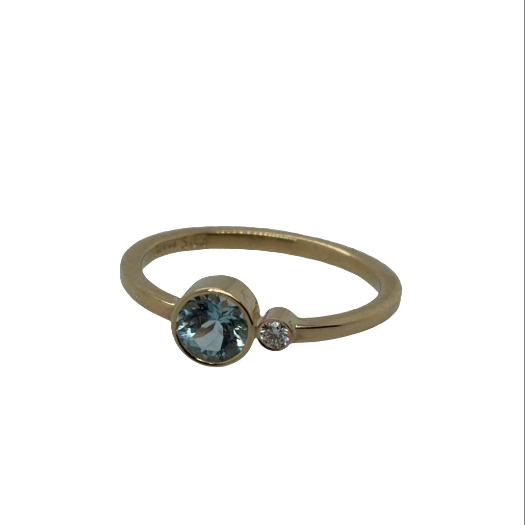 14 kt hringur smíðaður á verkstæðinu hjá okkur í meba með 5mm aquamarín og 3 pt tw/vvs demanti Aquamarín Demantur 585 gulagull Stærð 53
