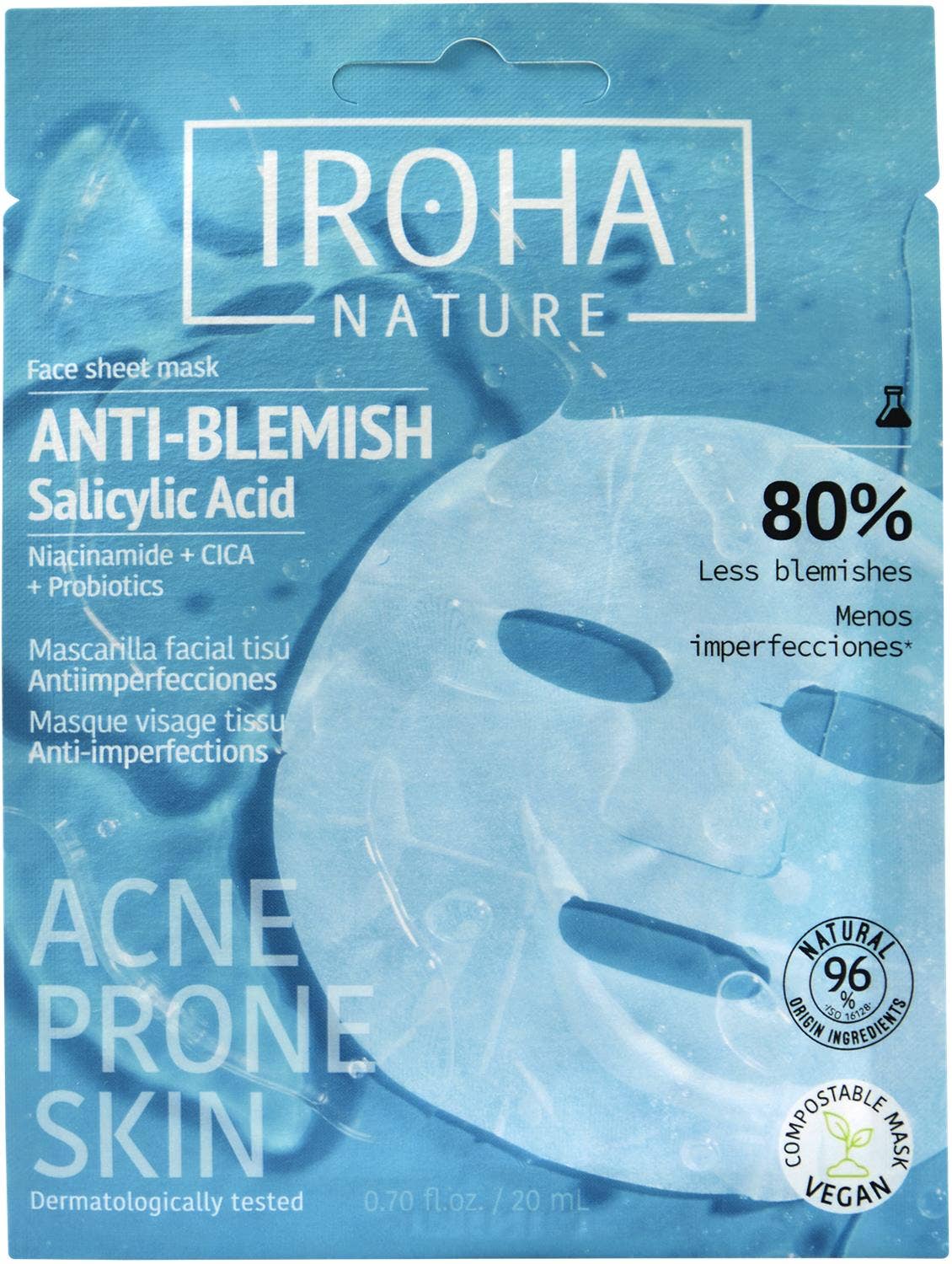 Iroha Nature bólumaskinn kemur í veg fyrir og dregur úr bólum. Einnig gefur hann raka og kemur á jafnvægi á fitumyndun í húðinni.
