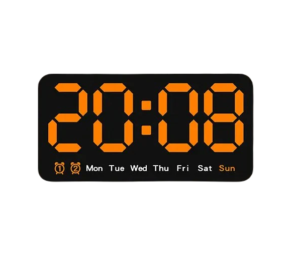 Klukka með mjög stórum og greinilegum tölustöfum, 2 vekjurum og sýnir vikudaga.
