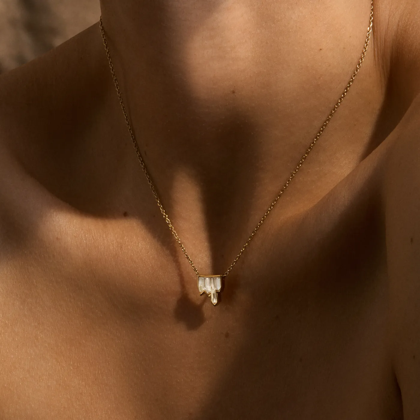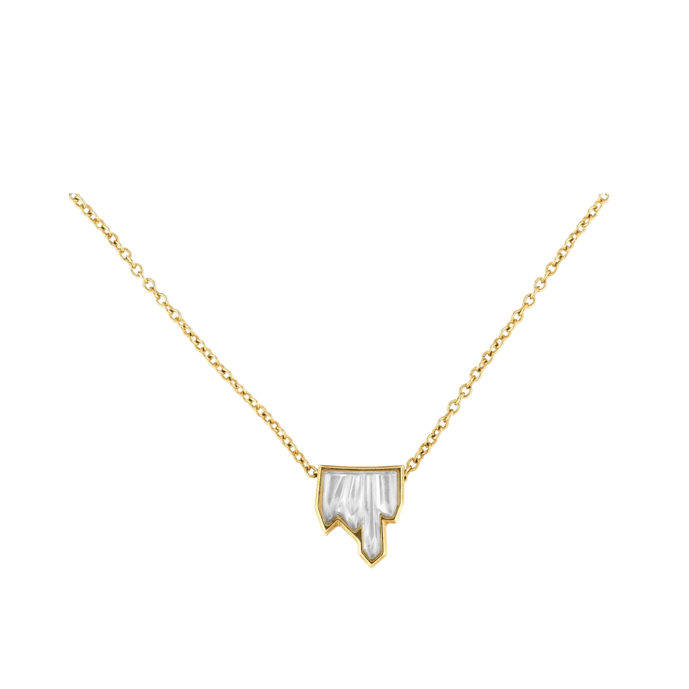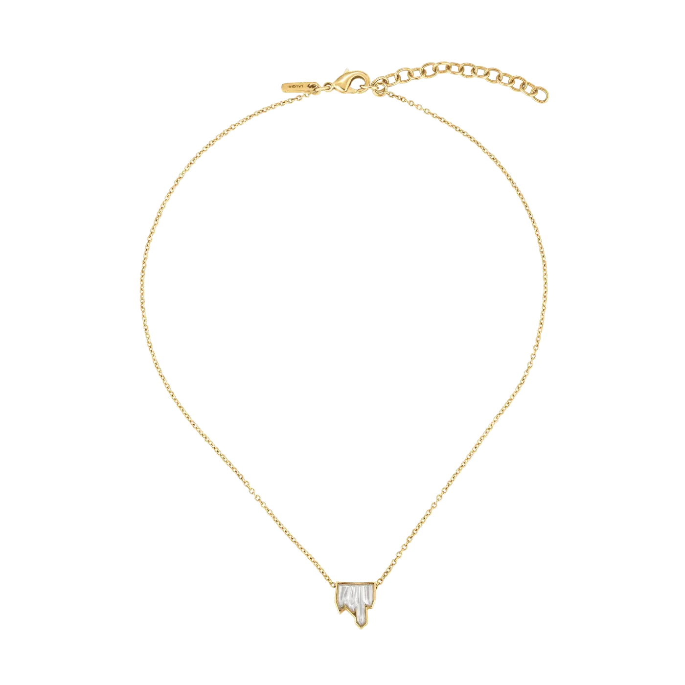 Efni hálskeðju: 18kt gullhúðað látún Lengd keðju: 40cm - 45cm Efni hálsmens: 18kt gullhúðað látún og franskur Laique kristall Stærð hálsmens: 1cm x 1cm