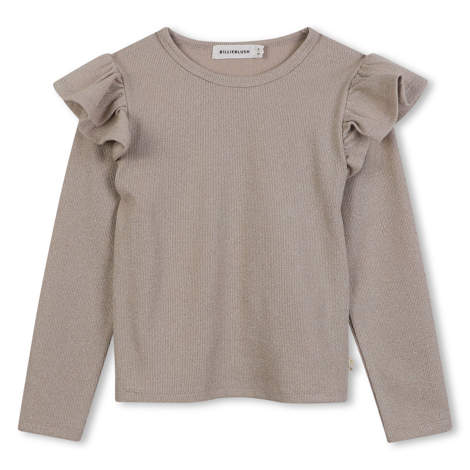 Ljós brúnn langerma bolur með glimmerþráðum og pífu við axlir. 57% bómull, 27% polyester, 10% metalised fiber og 5% elastane.