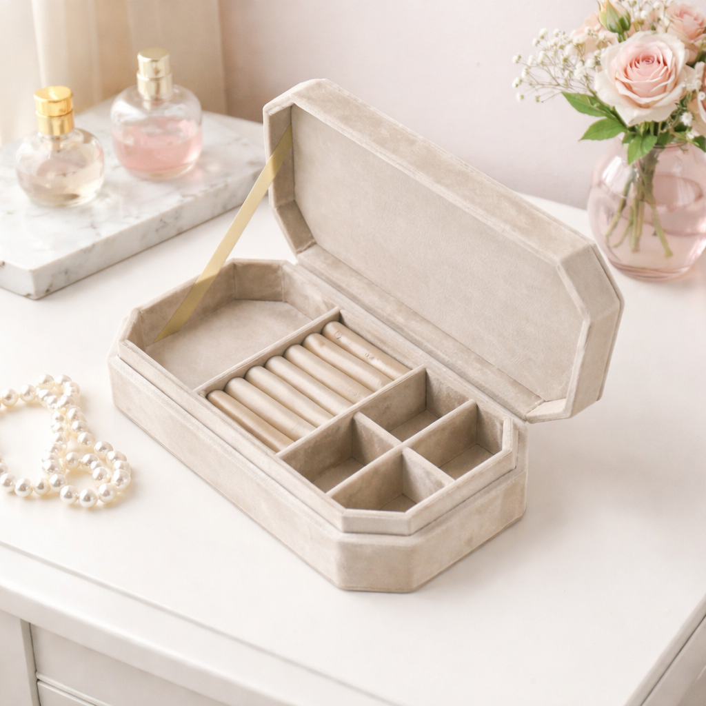 Mjög fallegt skartgripaskrín með flauelsáferð sem lætur fara vel um skartgripina þína