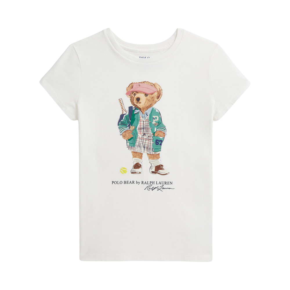 Hvítur stuttermabolur frá Polo Ralph Lauren með sætri bangsamynd að framan. 100% bómull.