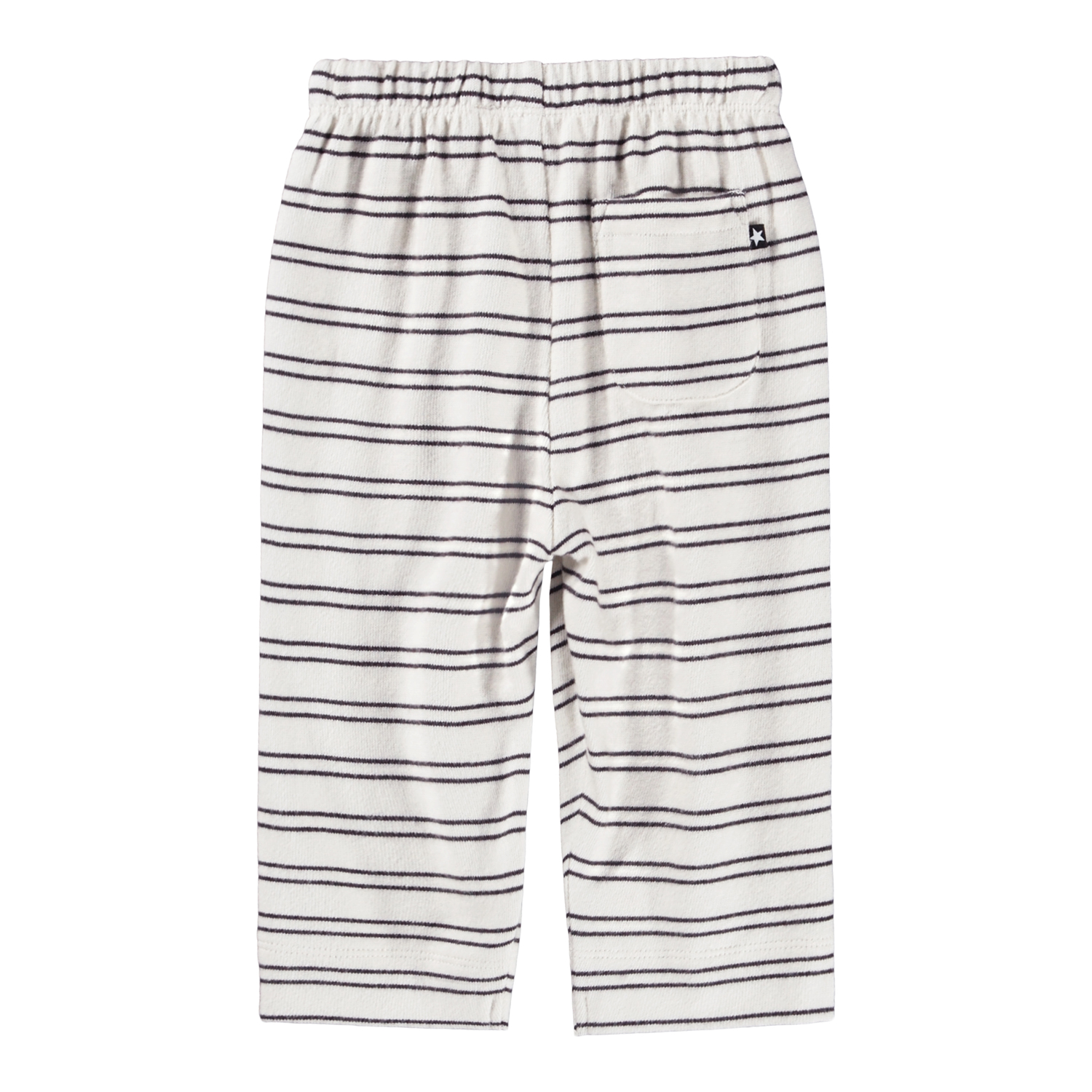 Röndóttar, mjúkar Molo buxur. Buxurnar eru bundnar í mittið. 100% bómull.
