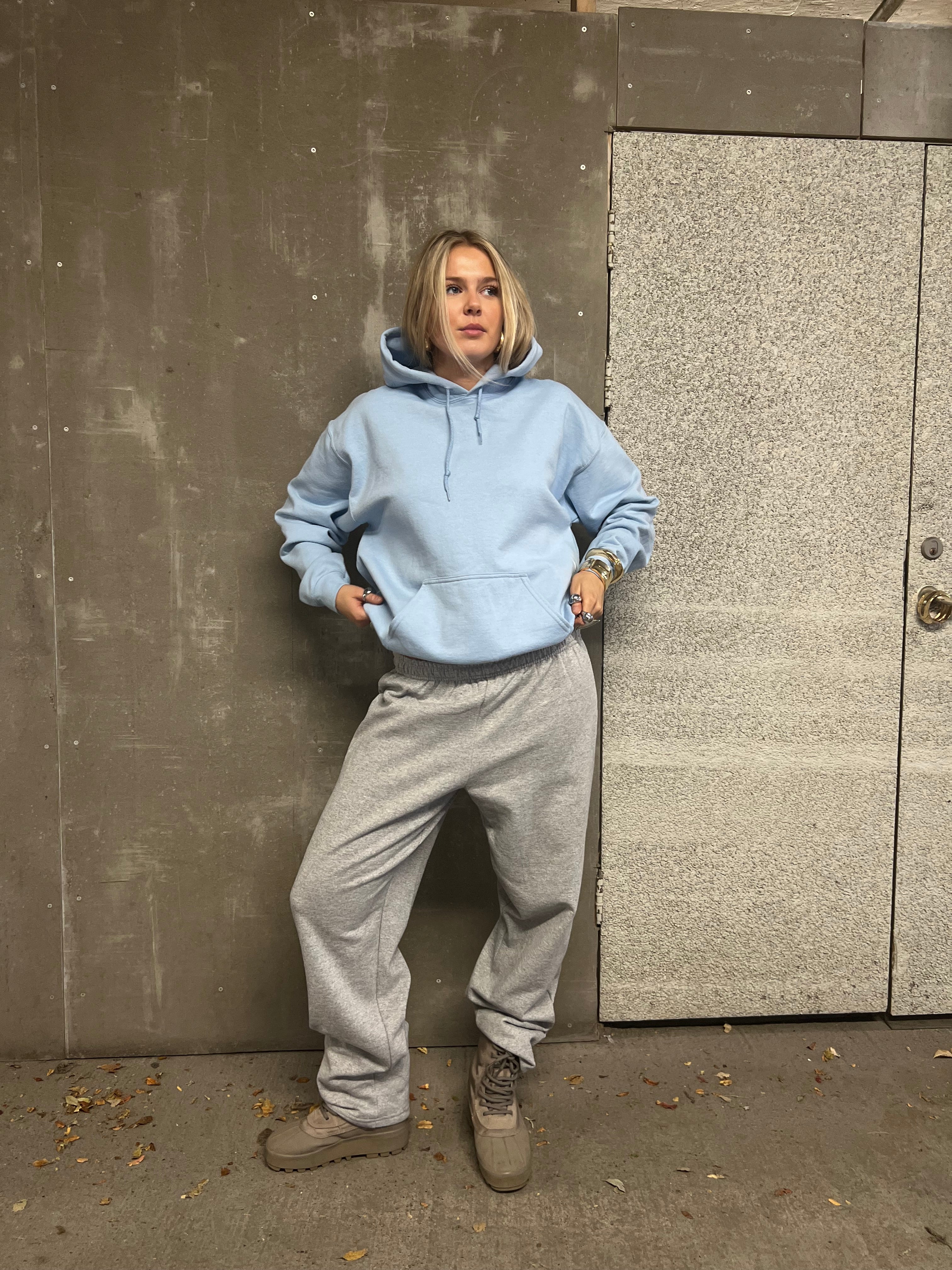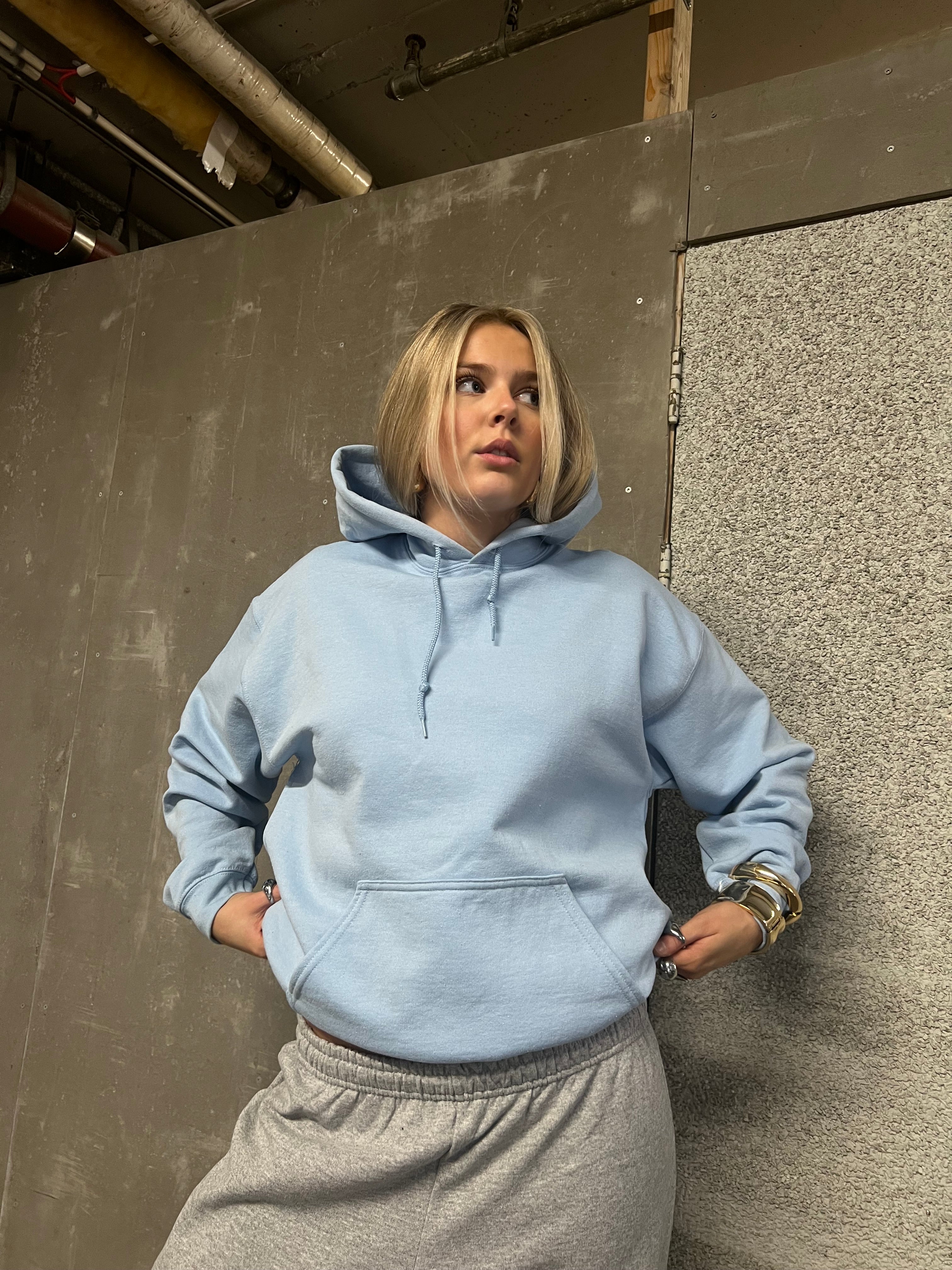 Ljósblá hettupeysa  fæst í stærðum S-L Módel er 170 cm á hæð og er í stærð L