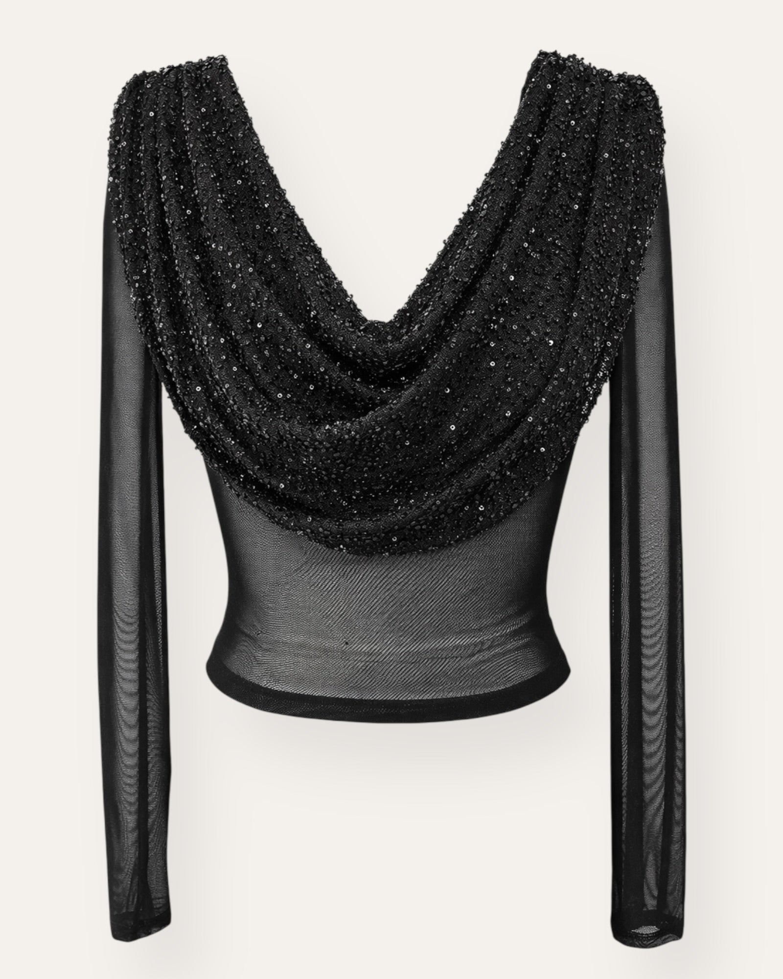 Glæsilegur mesh toppur sem gefur outfitinu extra glam. Topurinn er úr gegnsæju mesh efni með fallegu draperuðu perluefni að framan sem glitrar fallega. Fullkominn fyrir kvöldið, veislur eða ... Sjá nánar