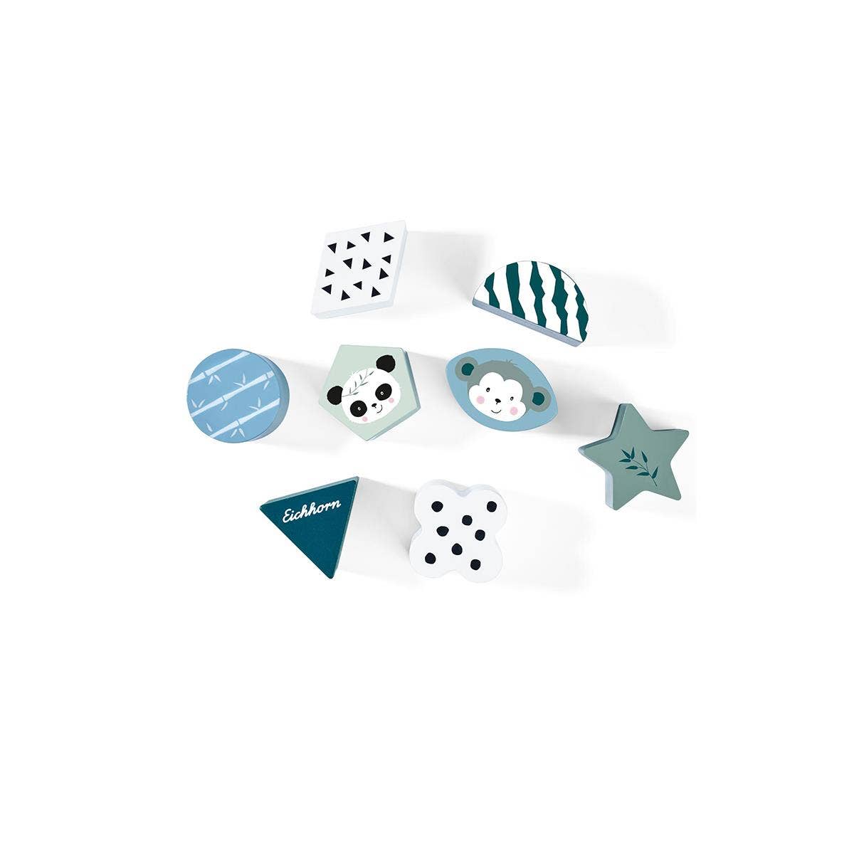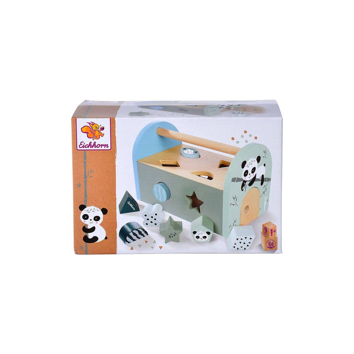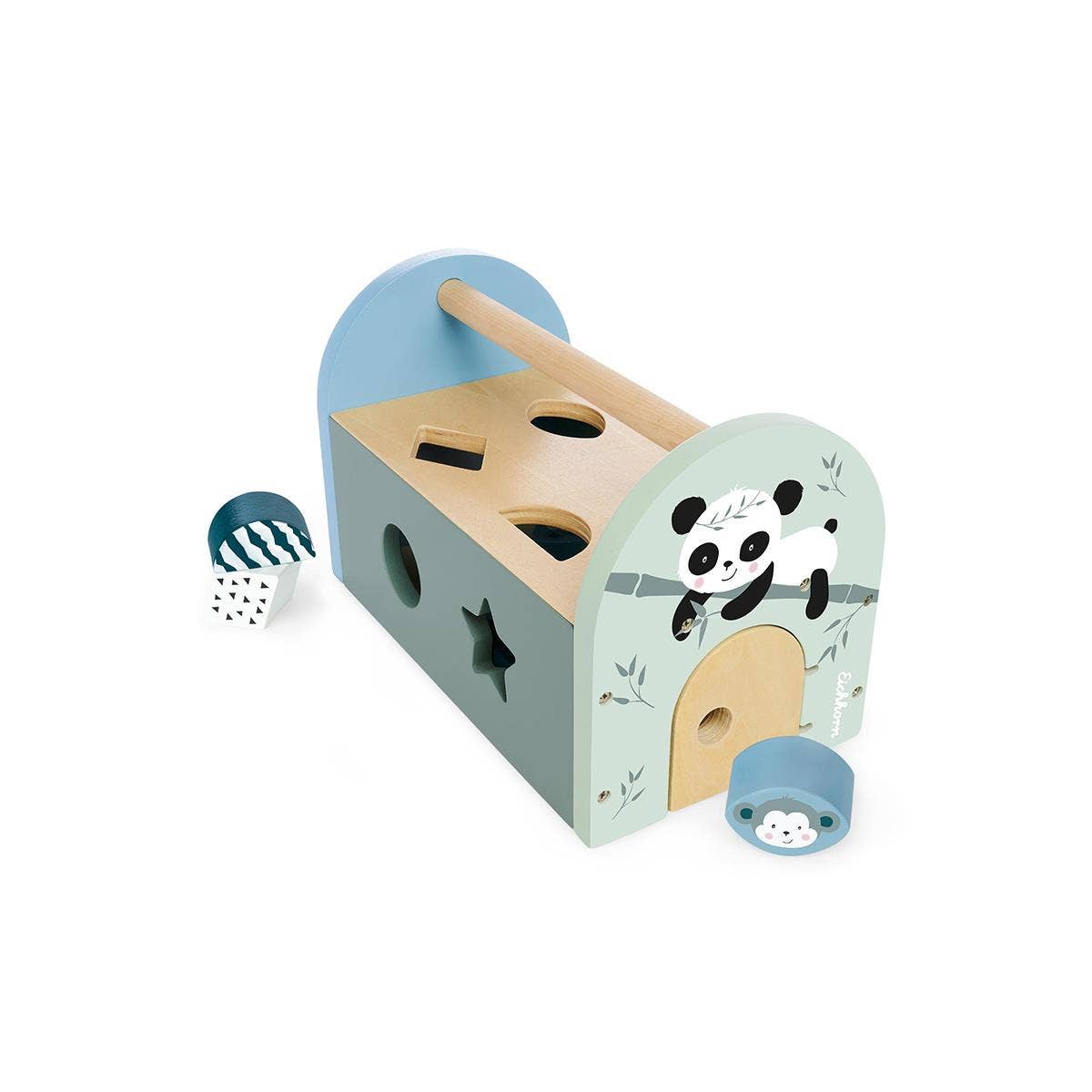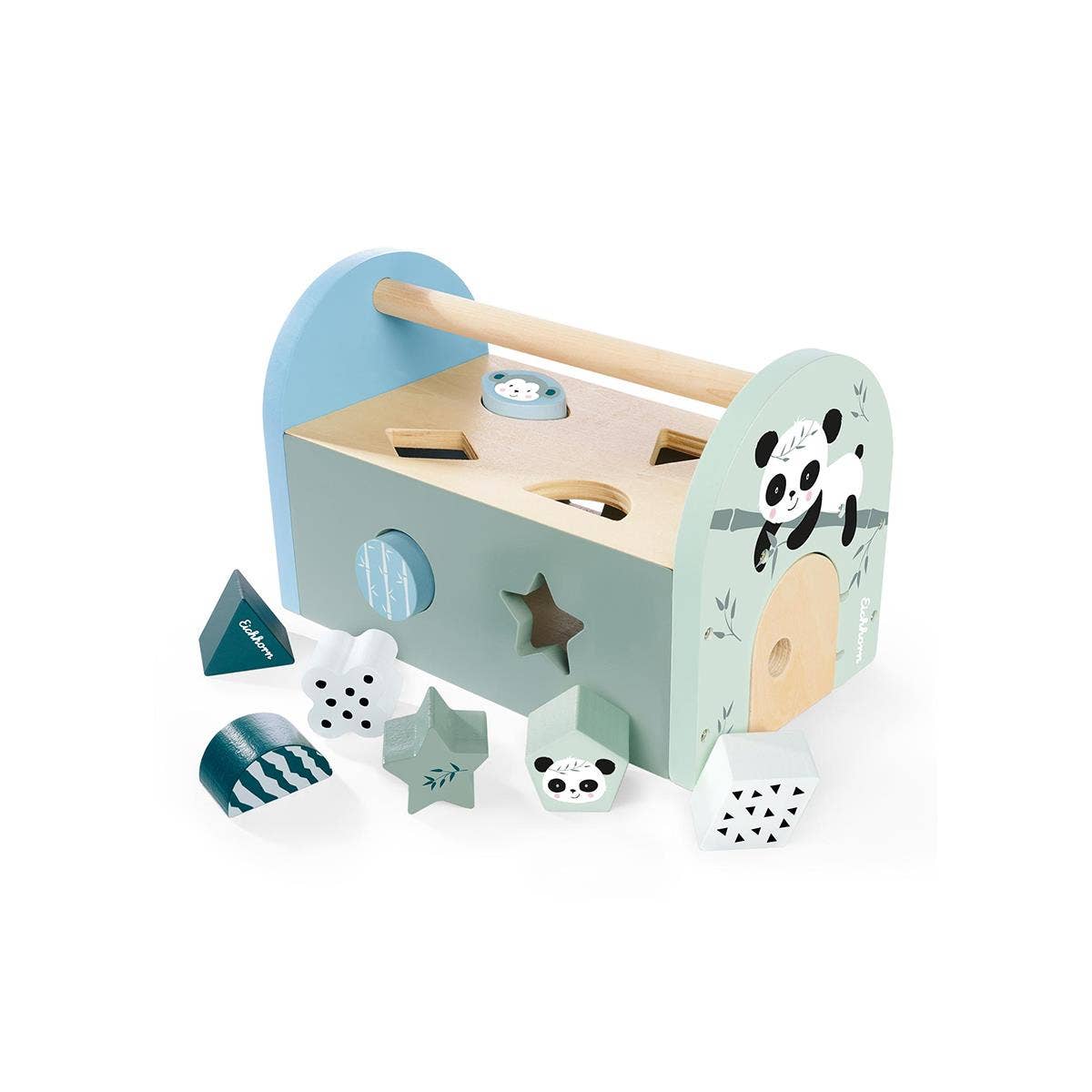 Fallegur viðarkassi með holum sem eru mismunandi í laginu ásamt kubbum.