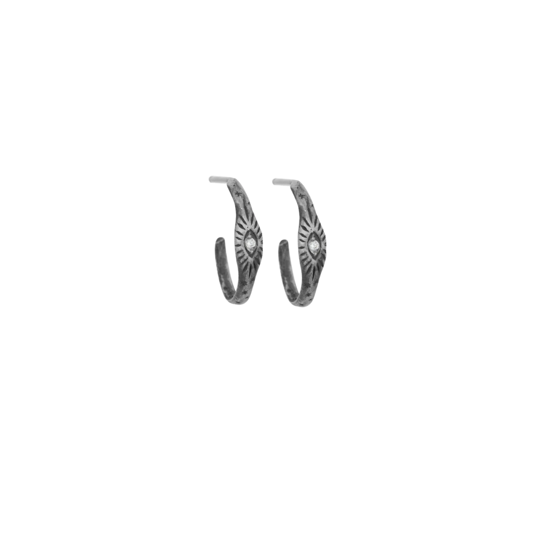 Small silver earrings with The Eye engraved.With 0,01ct diamond in each eye.Length (front) = 1.5 cm / 0.6 inchesMaterials & careMetals can be worn in water but can change color in geothermal ... Sjá nánar