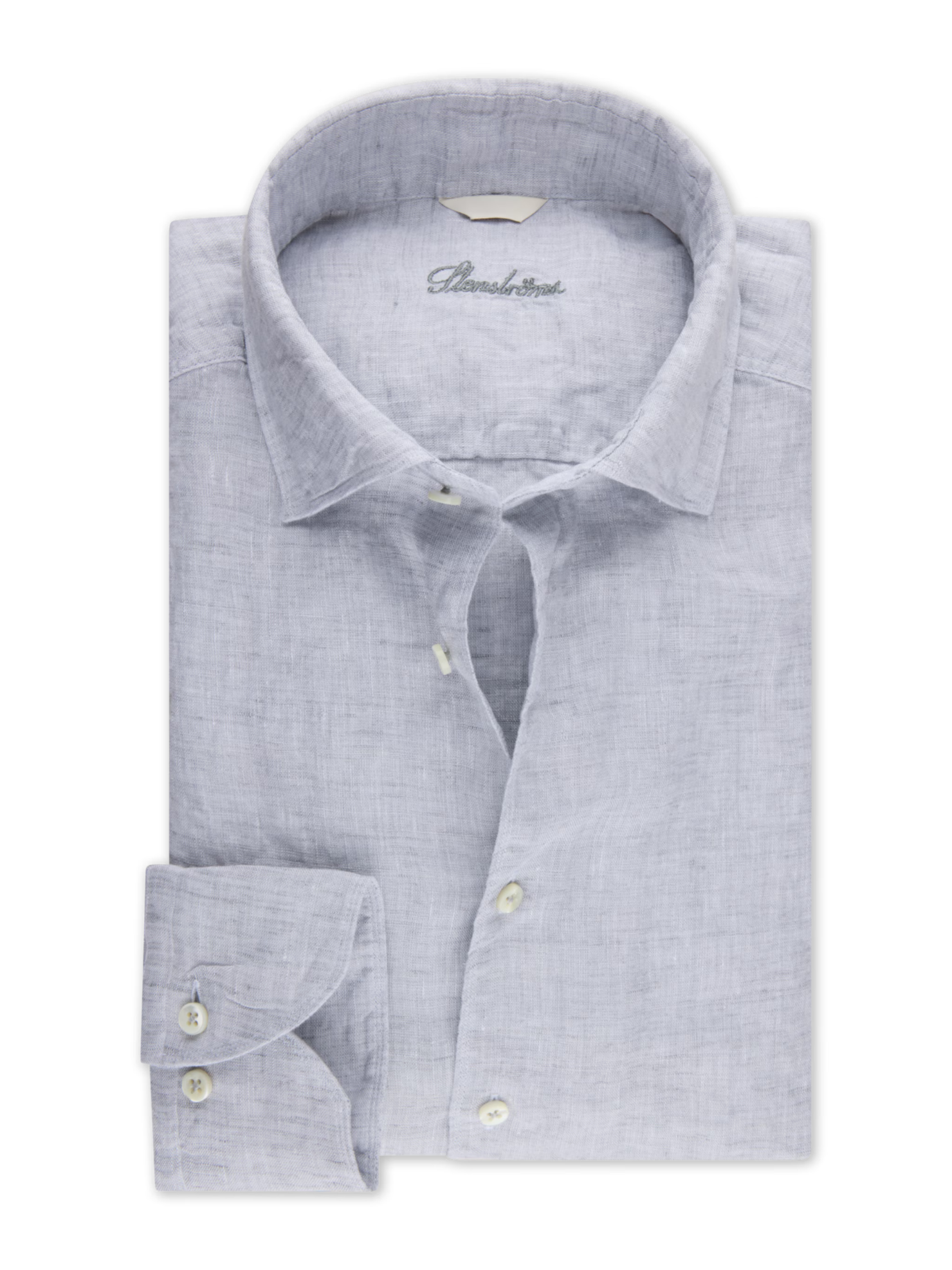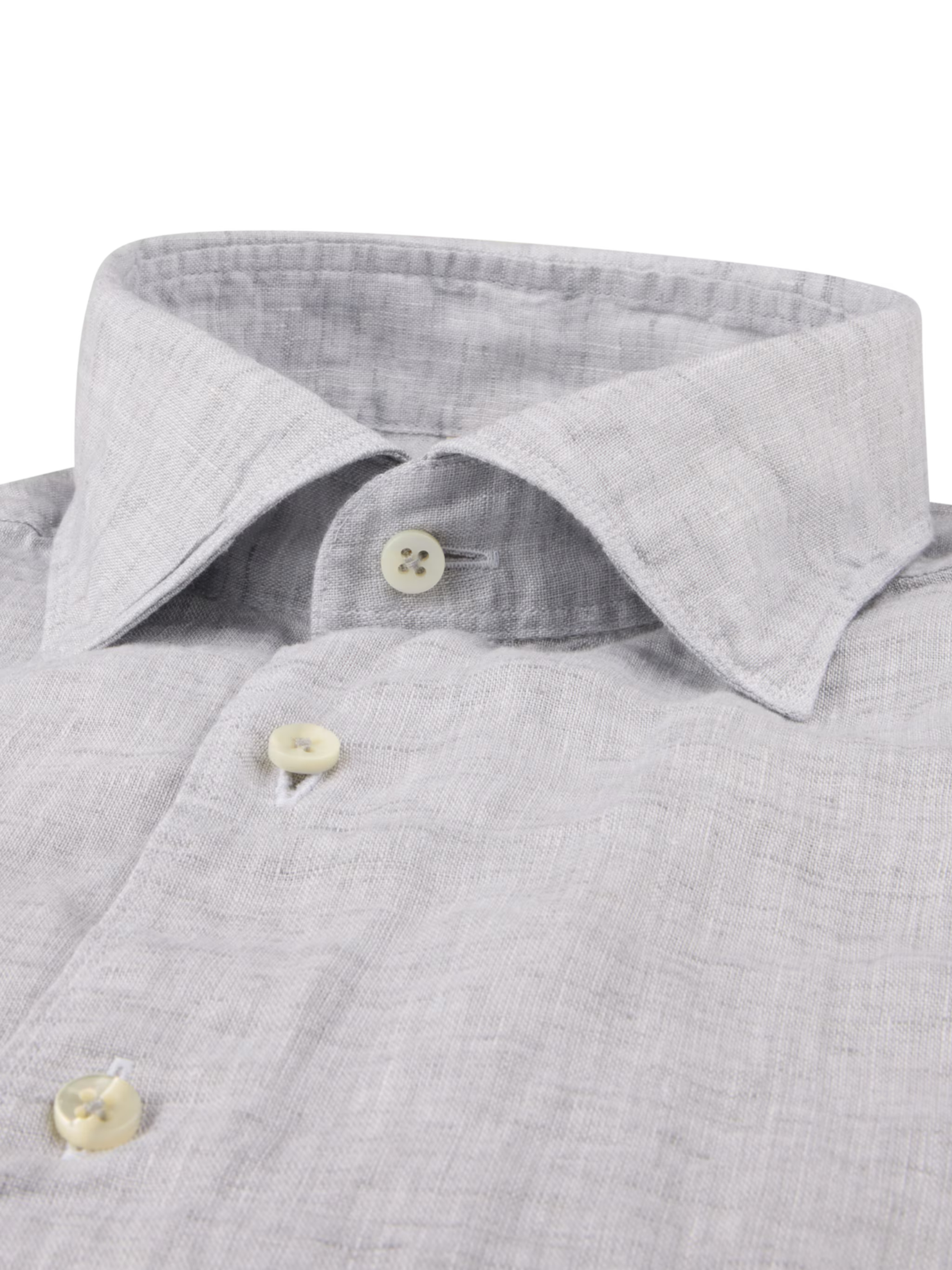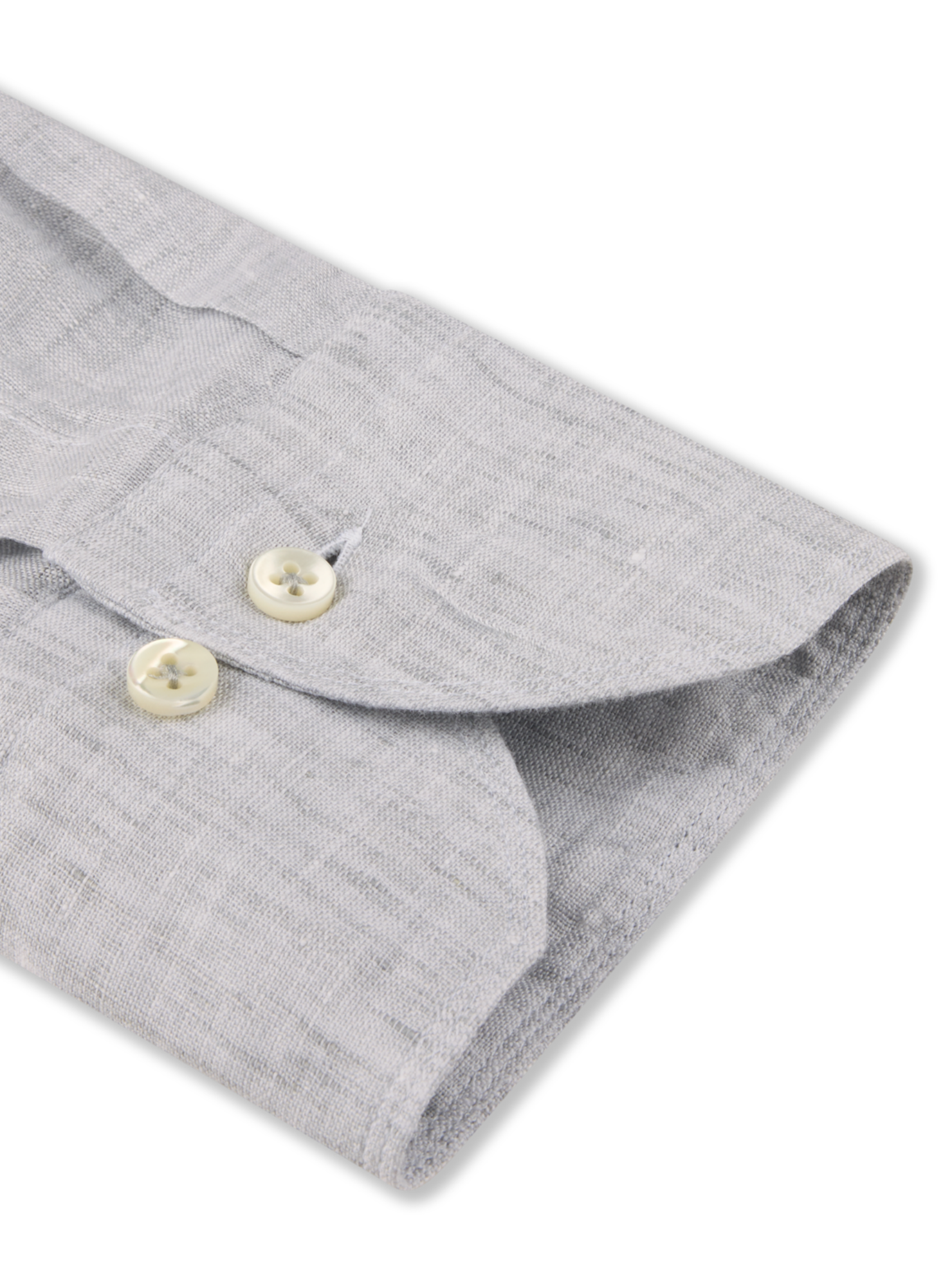 This shirt is made of linen and is detailed with mother of pearl buttons, single cuffs and a cut away collar. Moderate cut away collar, No.72 Single Cuff Linen Mother of Pearl Buttons Linen 100%