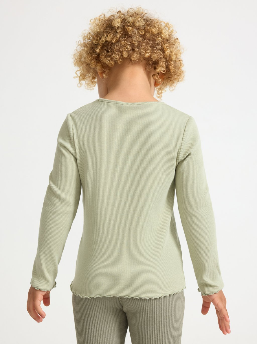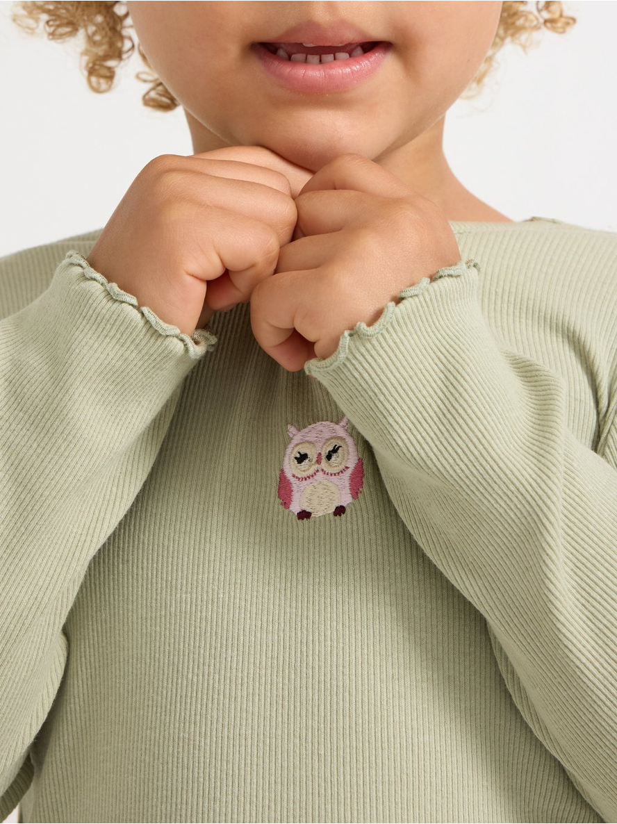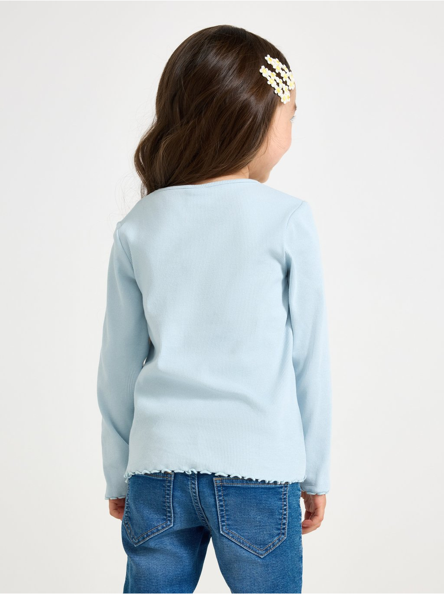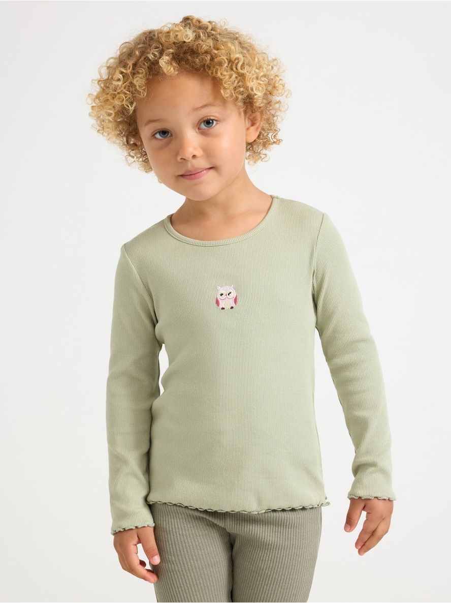 Ribbed top in soft, stretchy cotton with frill trims and a small embroidery on the front. Round neckline Long sleeves Contains 75% organic cotton Contains 20% recycled cotton 95% ... Sjá nánar