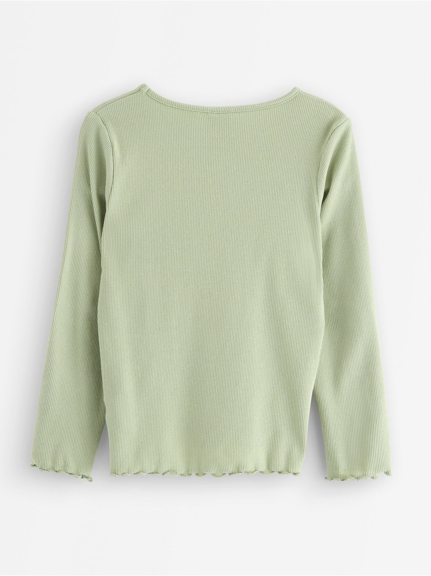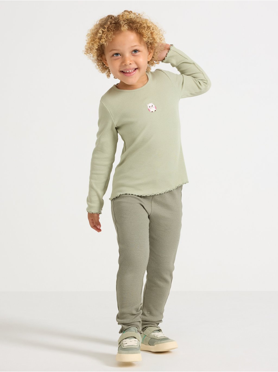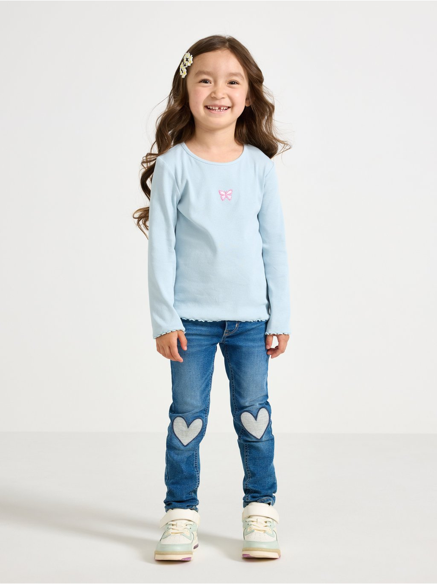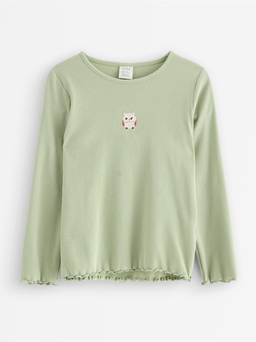 Ribbed top in soft, stretchy cotton with frill trims and a small embroidery on the front. Round neckline Long sleeves Contains 75% organic cotton Contains 20% recycled cotton 95% ... Sjá nánar