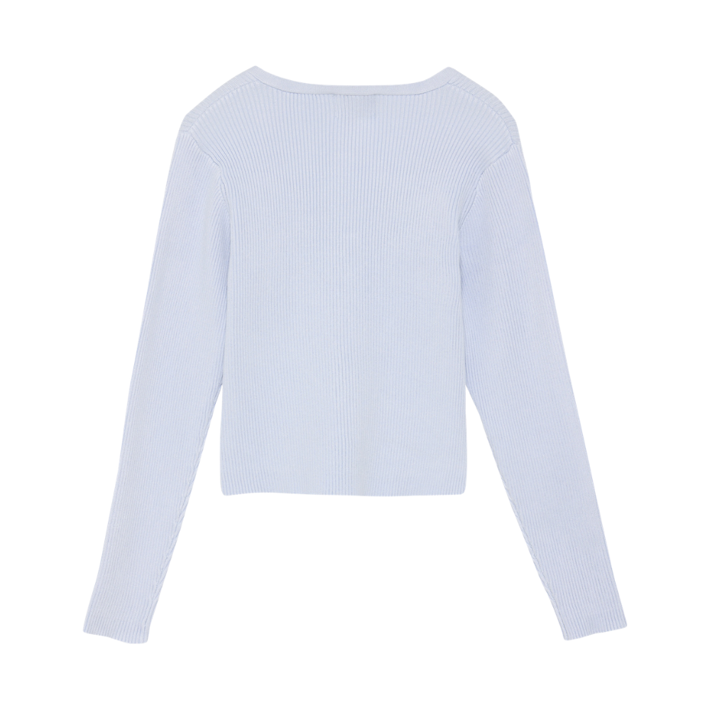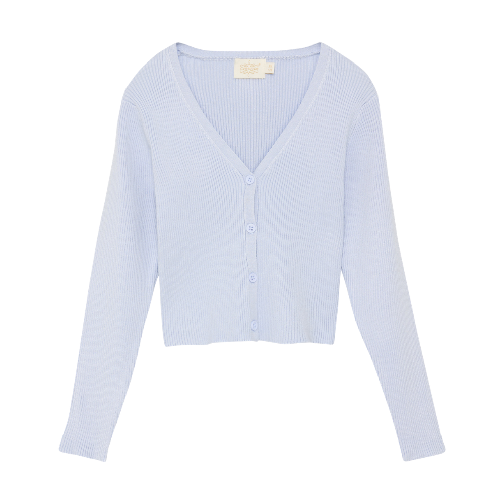 Ljós blá, hneppt peysa með V-hálsmáli. 80% viscose og 20% nylon.