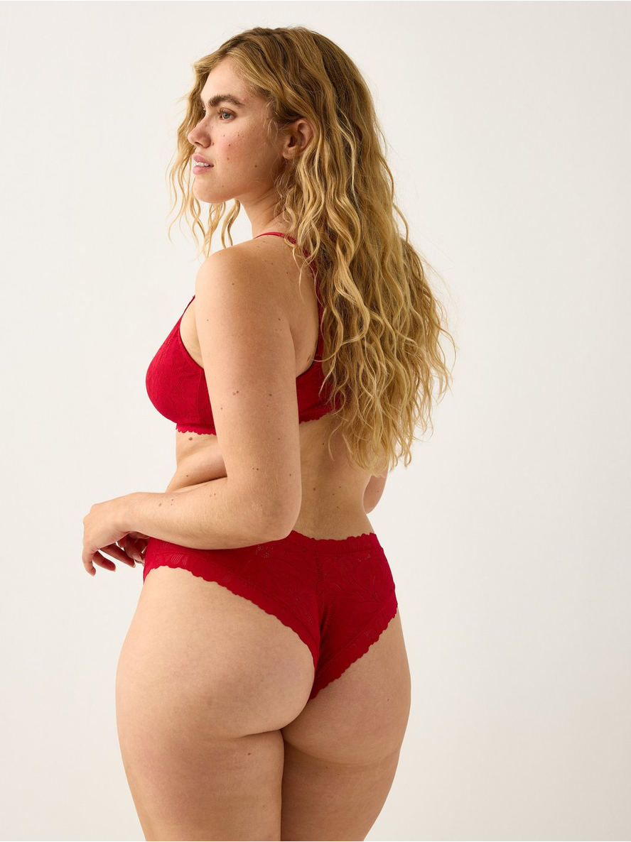 Brazilian briefs in soft and comfy lace with a regular waist. Lined crotch Regular waist Contains 51% recycled polyamide 77% pólýamíð 23% elastan