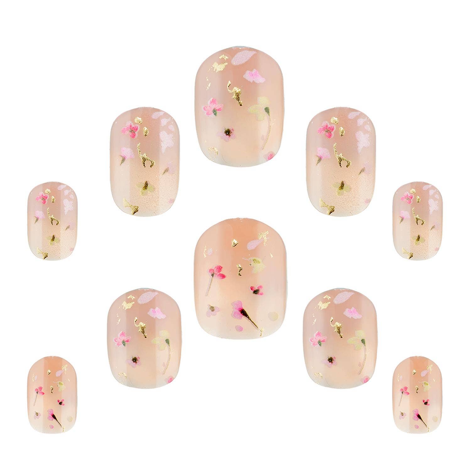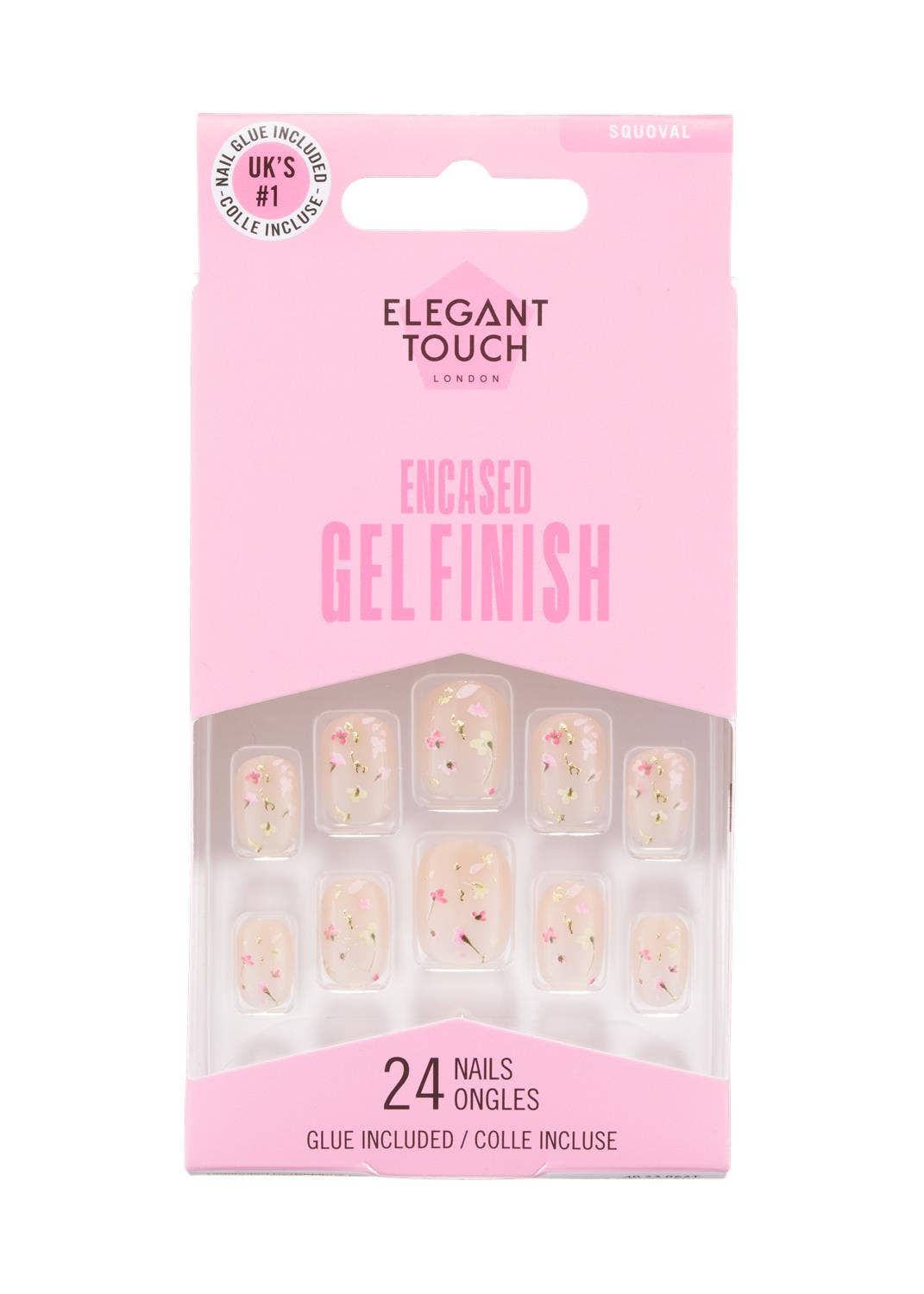 Squoval-neglur með fallegu blómamynstri sem eru hjúpaðar inn í tært og þykkt, gljáandi gel yfirlakk.