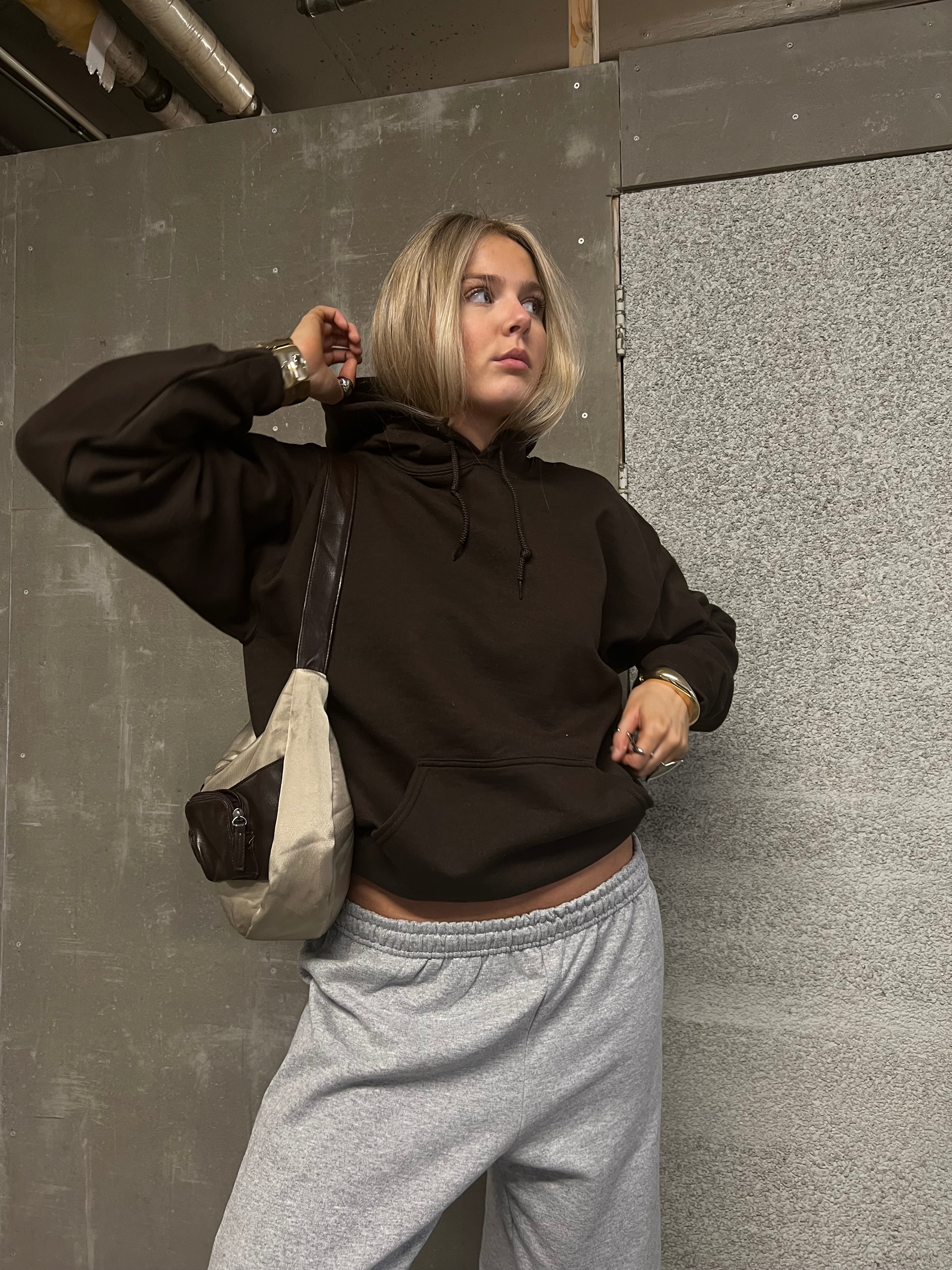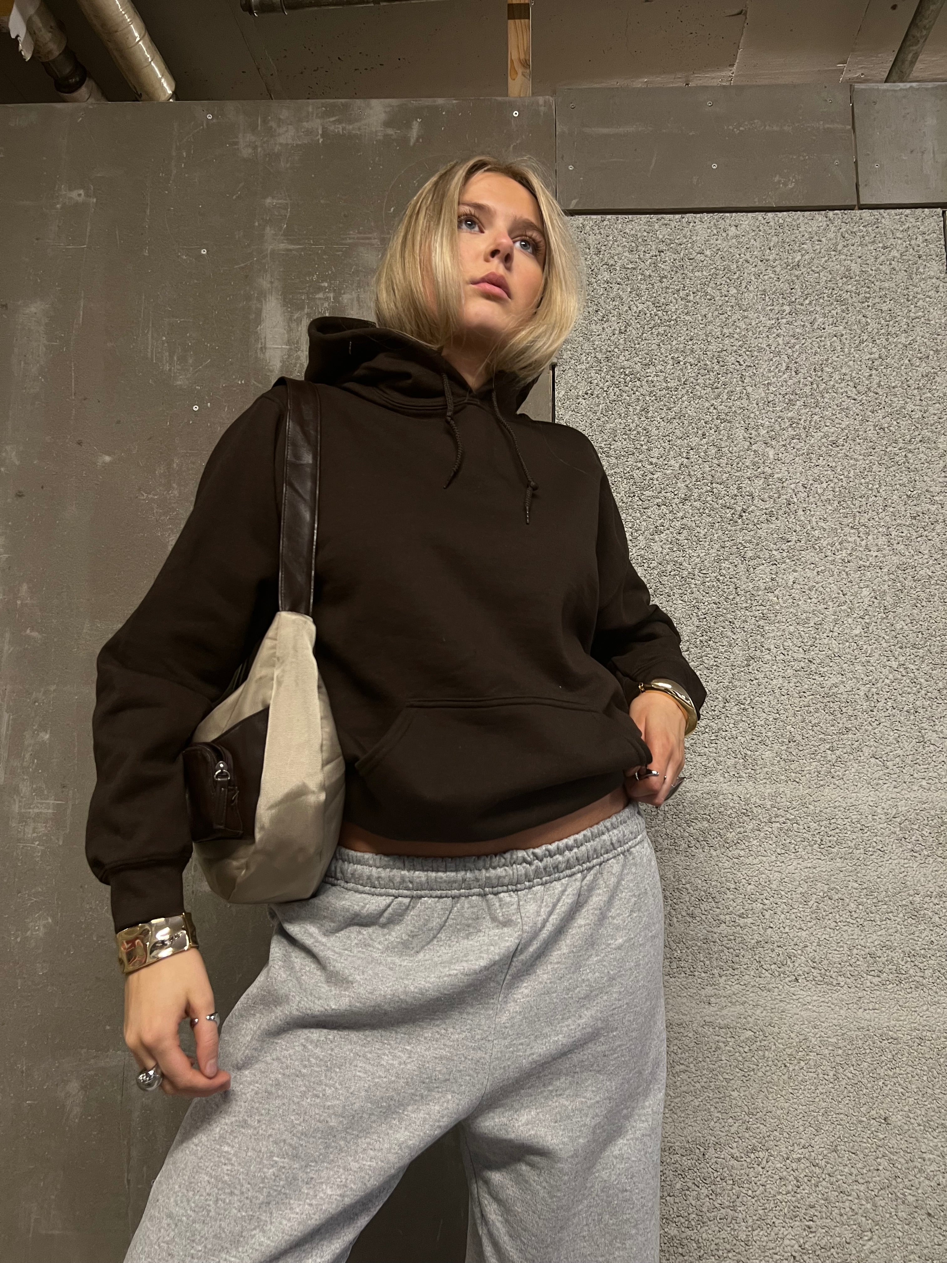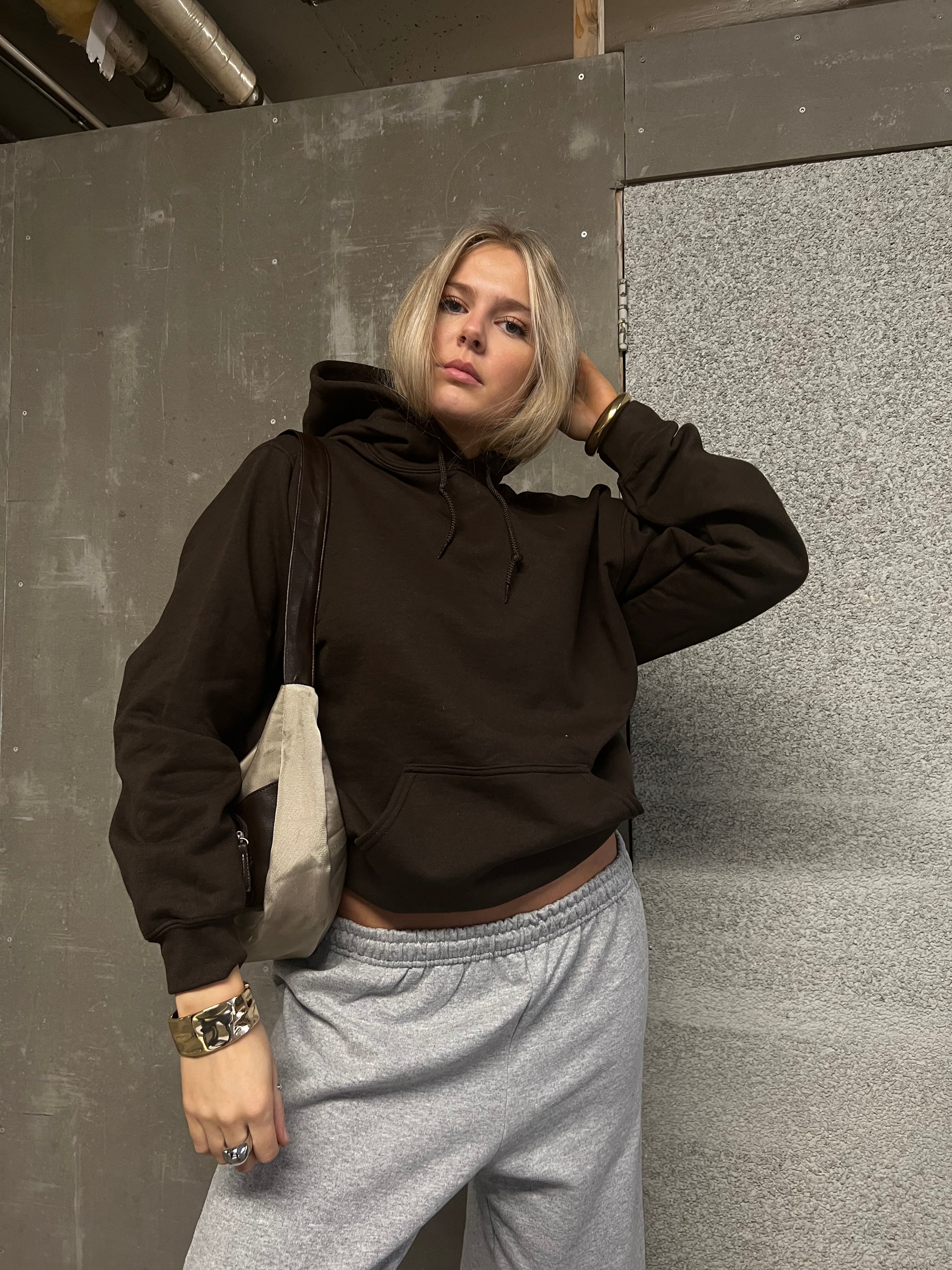 Dökkbrún hettupeysa  fæst í stærðum S-L.  Módel er 170 cm á hæð og er í stærð L