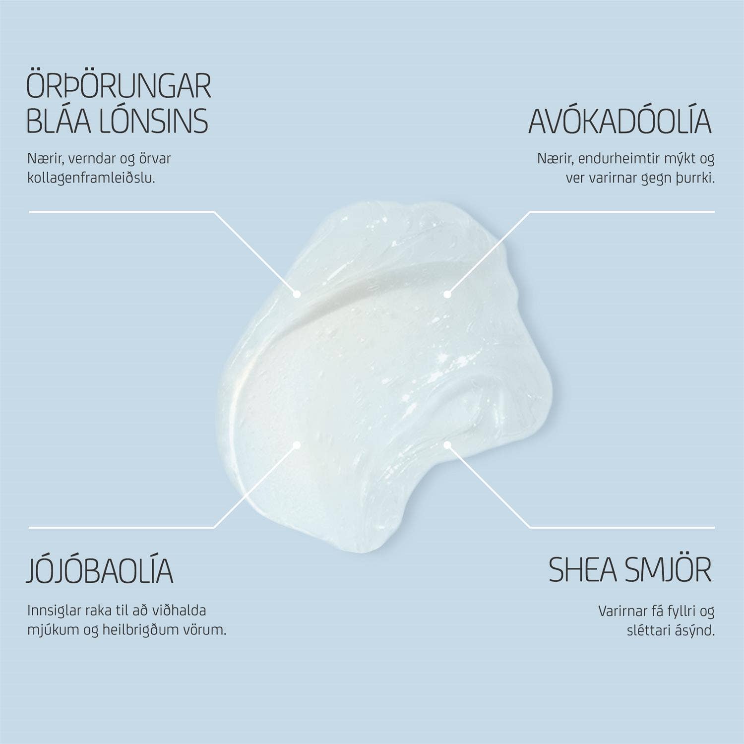Næringarríkur varasalvi sem verndar og mýkir varirnar samstundis auk þess að innsigla raka. Varirnar fá fyllri og sléttari ásýnd.
