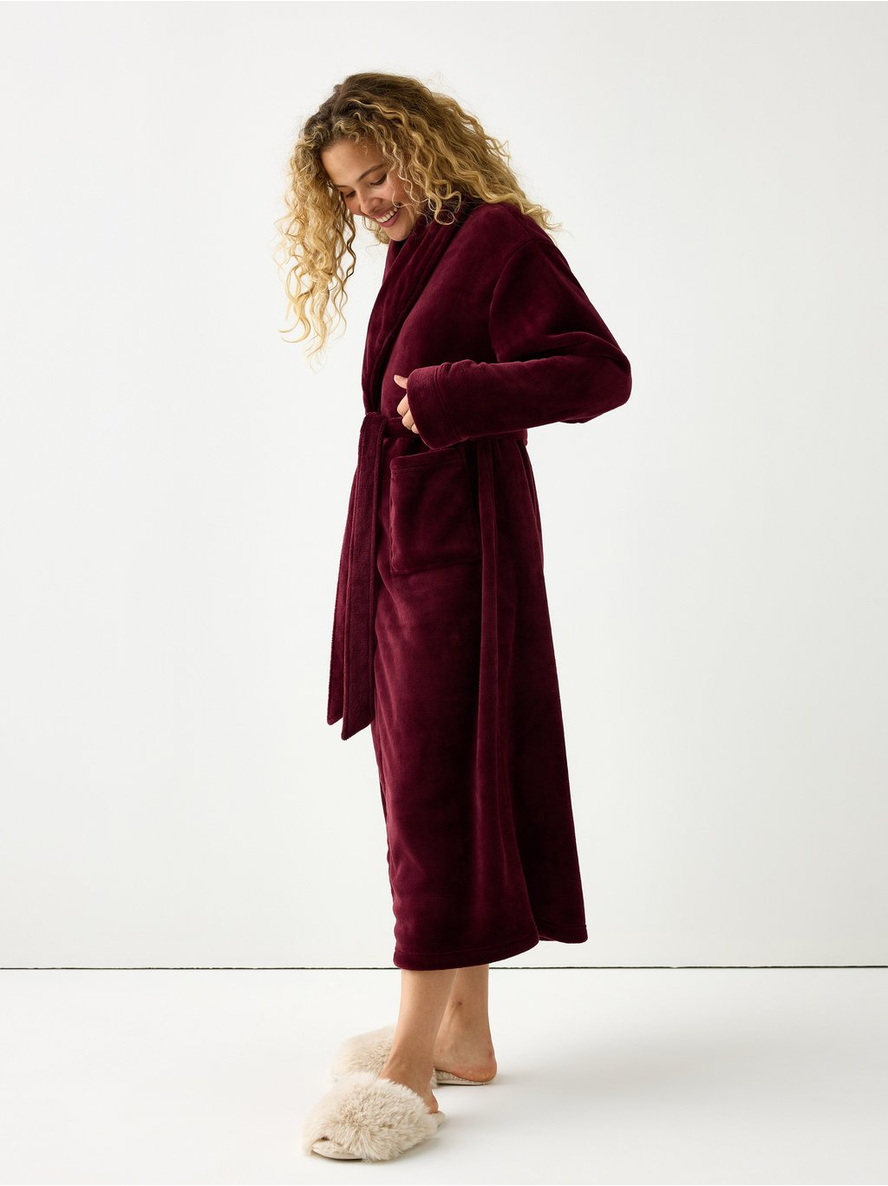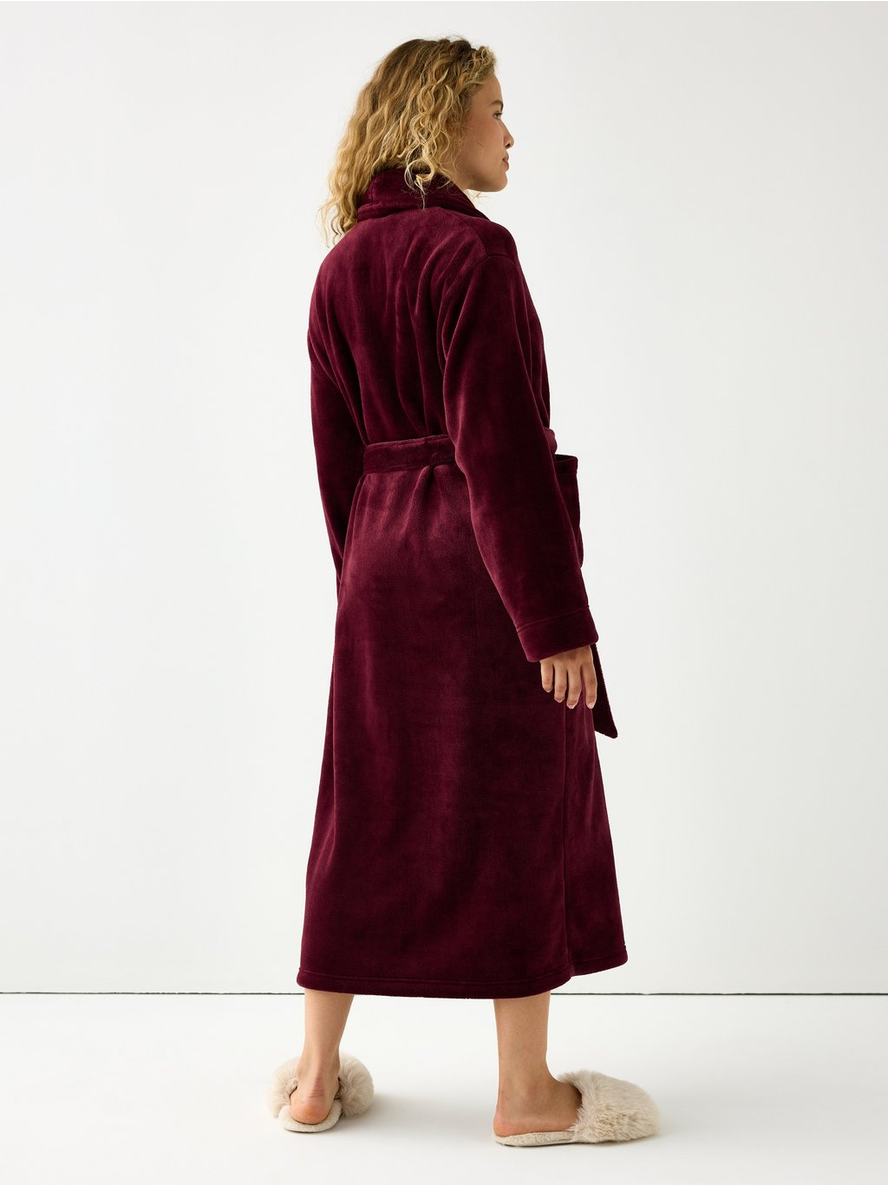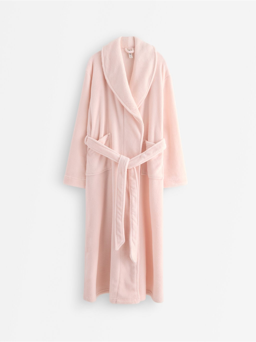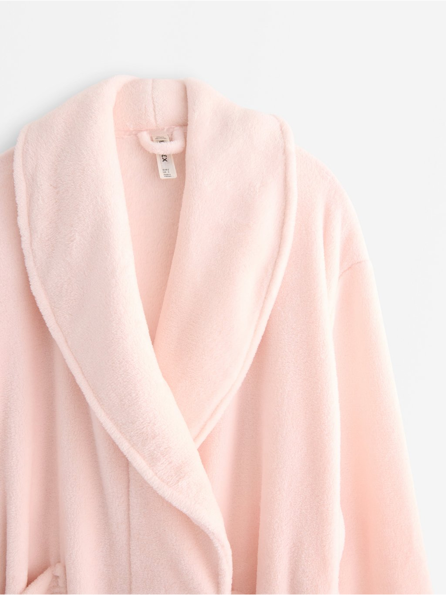 Soft fleece robe with with long sleeves and pockets to front. Open front Long sleeves Tie band at waist Length: 130 cm in size M 100% pólýester
