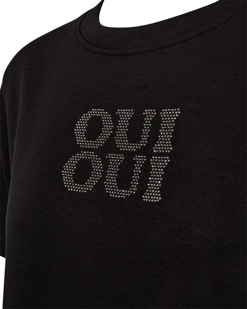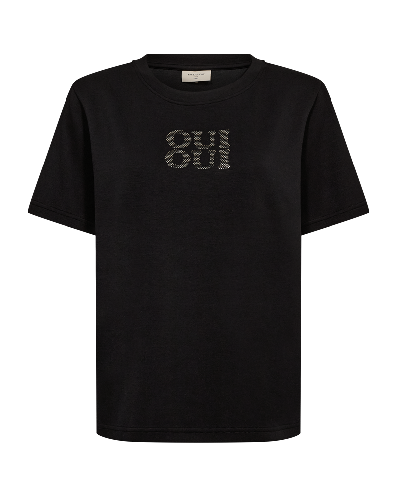 Stuttermabolur með steinum á frá Free/Quent. 52% polyester 43% viscose 5% teygja
