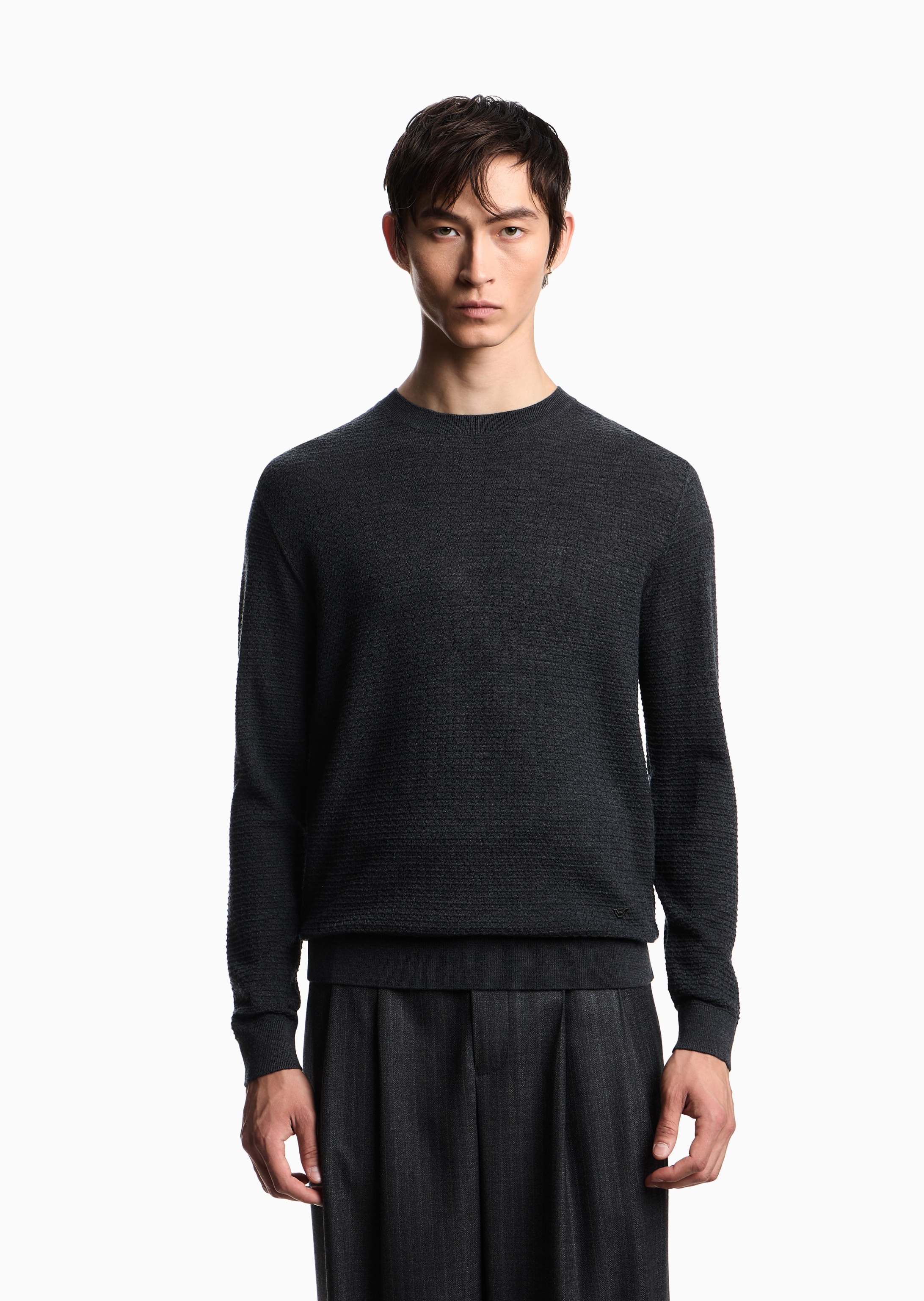 Crew-neck jumper made of pure virgin wool with a particularly tactile texture, with an embossed jacquard pattern that creates a natural intersection of structured and sophisticated motifs all ... Sjá nánar