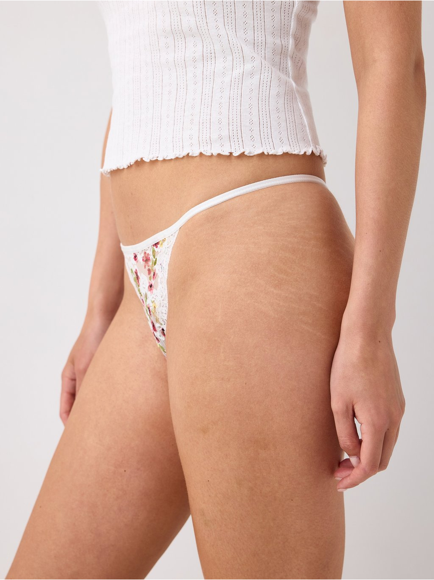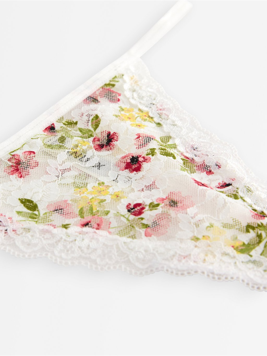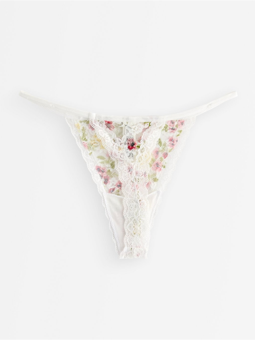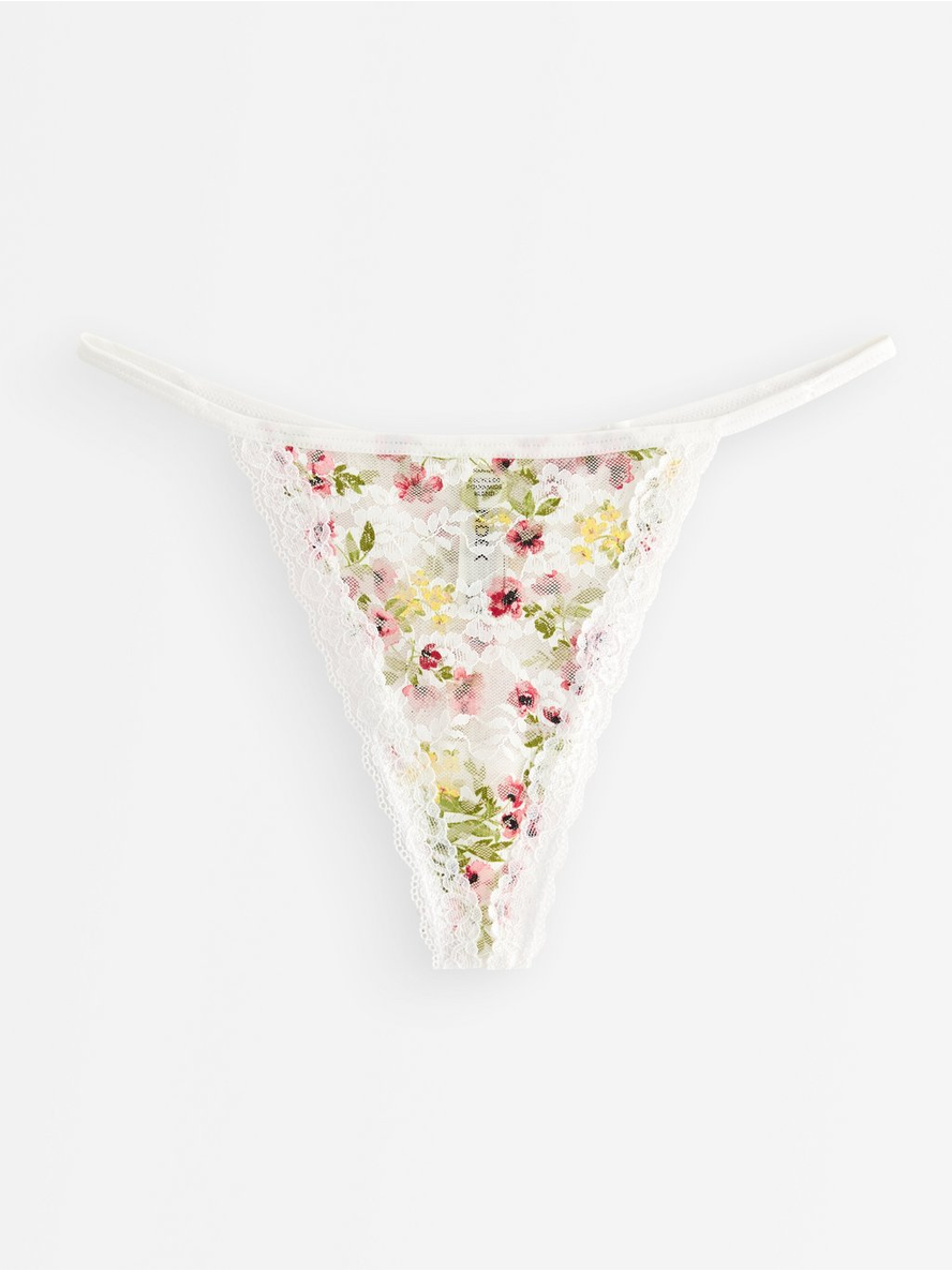 Thong with a low waist delicate lace with flower print. Low waist Contains 51% recycled polyamide 87% pólýamíð 13% elastan