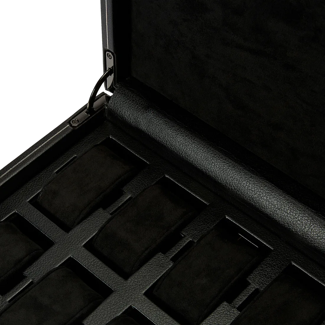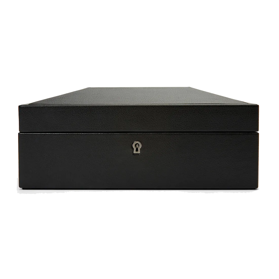 Efni: Veganleður Stærð: 19.7cm x 8.3cm x 8.3cm 8 hólf fyrir úr. Lás og lykill. Hleðslugat fyrir snjallúr.