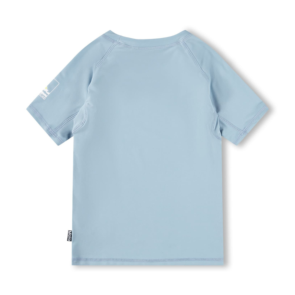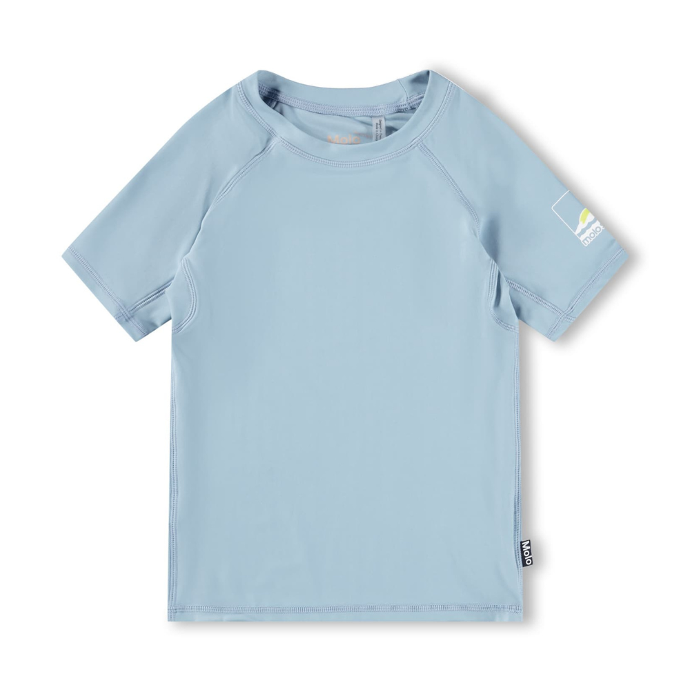 Ljós blár, einlitur sundbolur með stuttum ermum frá Molo. UV 50+ vörn gegn geilsum sólarinnar. 85% polyester og 15% elastane.