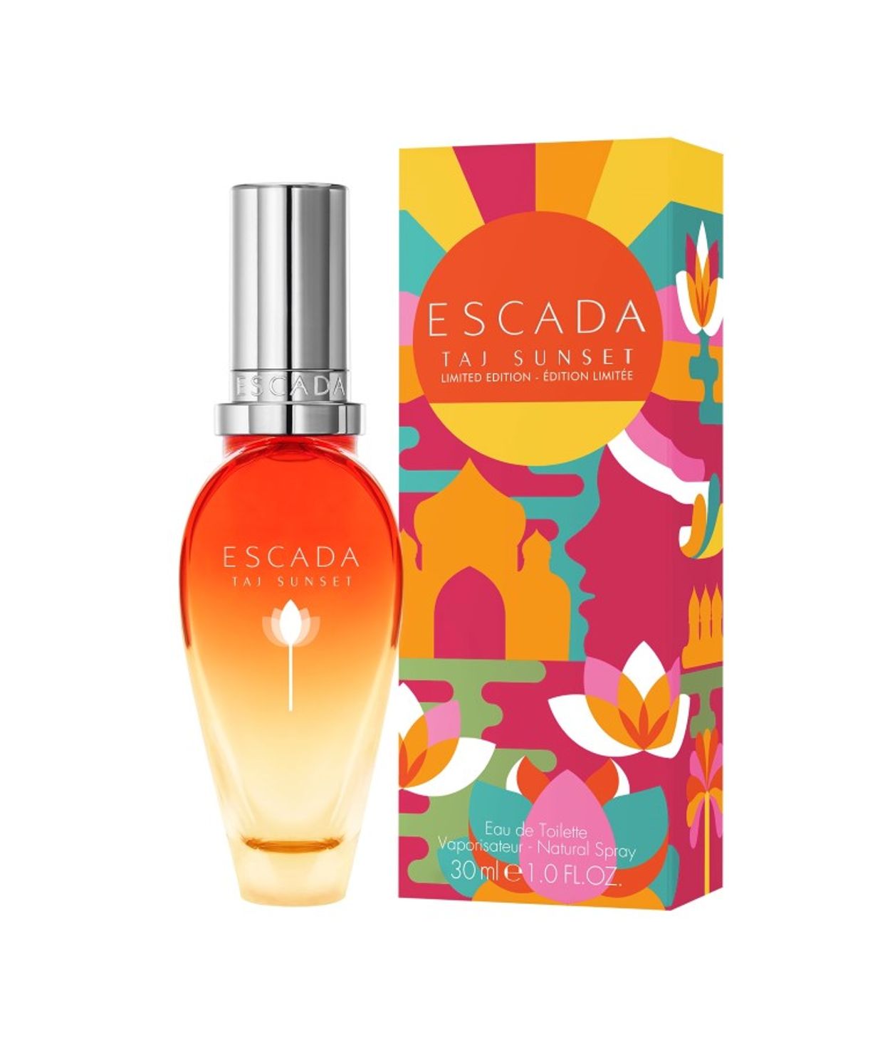Suðrænn sumarblær einkennir ilminn Escada Taj Sunset EDT Nótur: Mango accord, lotus flower , Coconut accord.