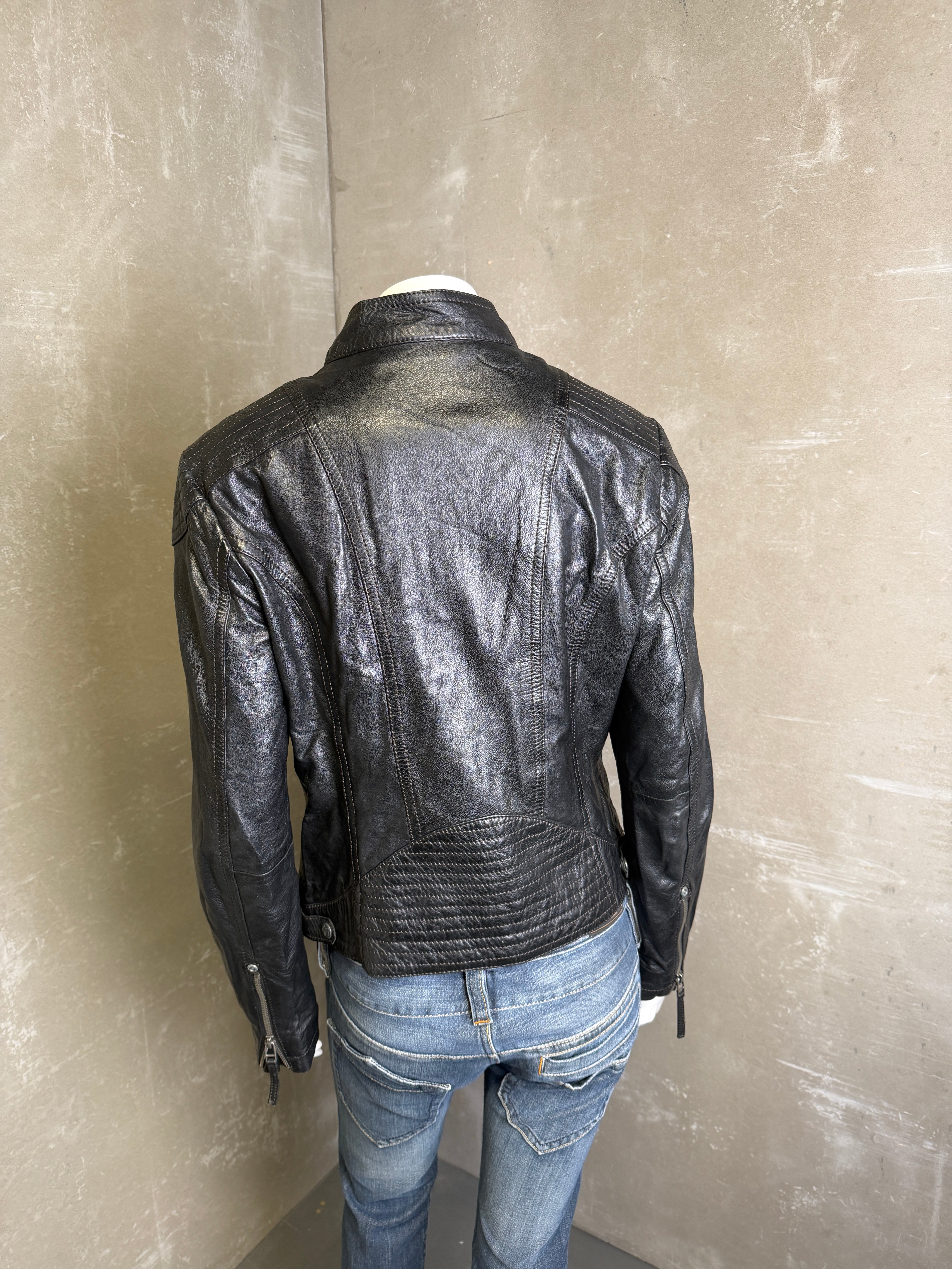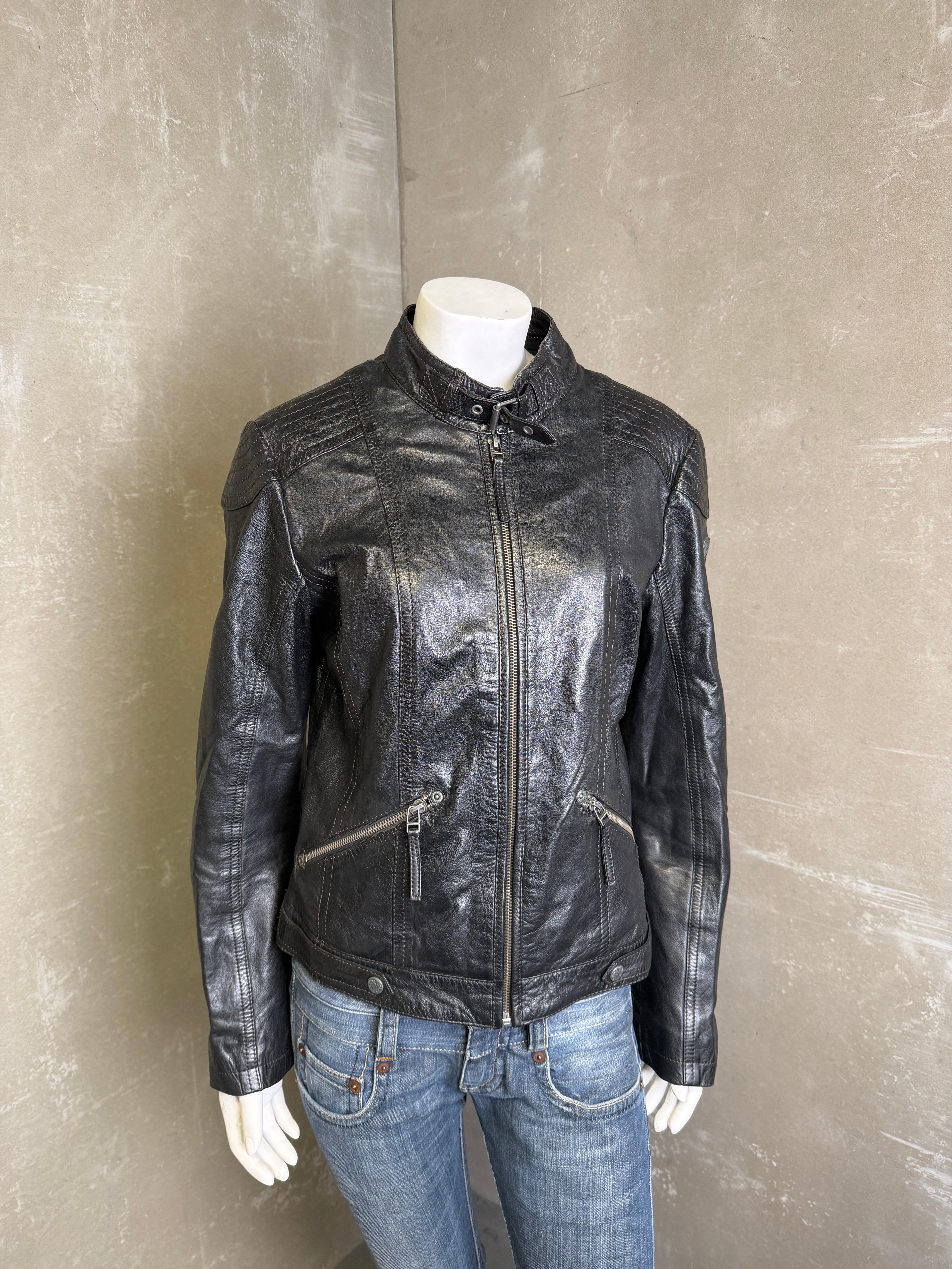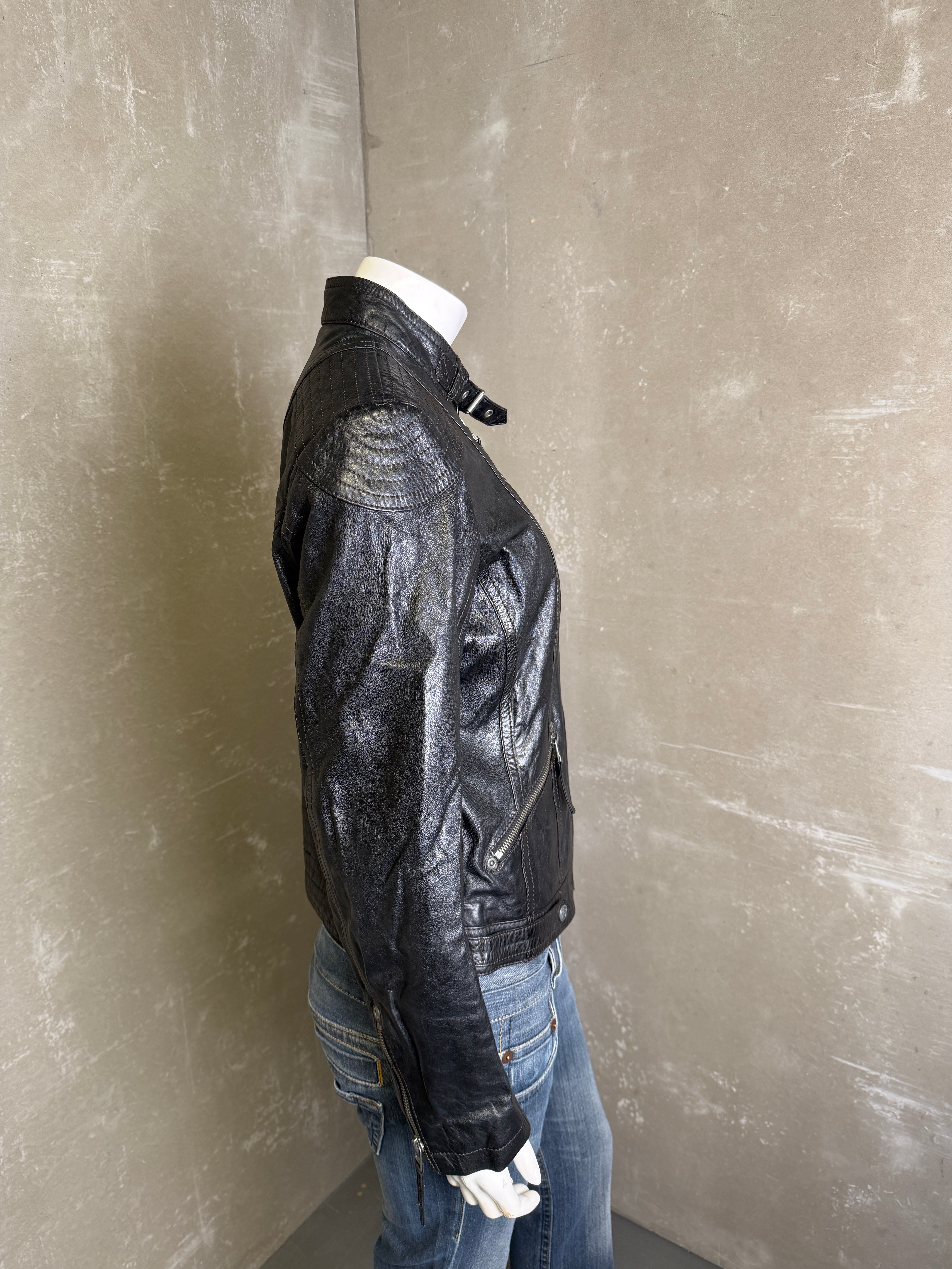 Leðurjakki Fittar S-M Gína er 170 hæð í stærð S. Vintage flíkur geta sýnt ummerki um notkun  Vara einungis fáanleg í netverslun Nr59