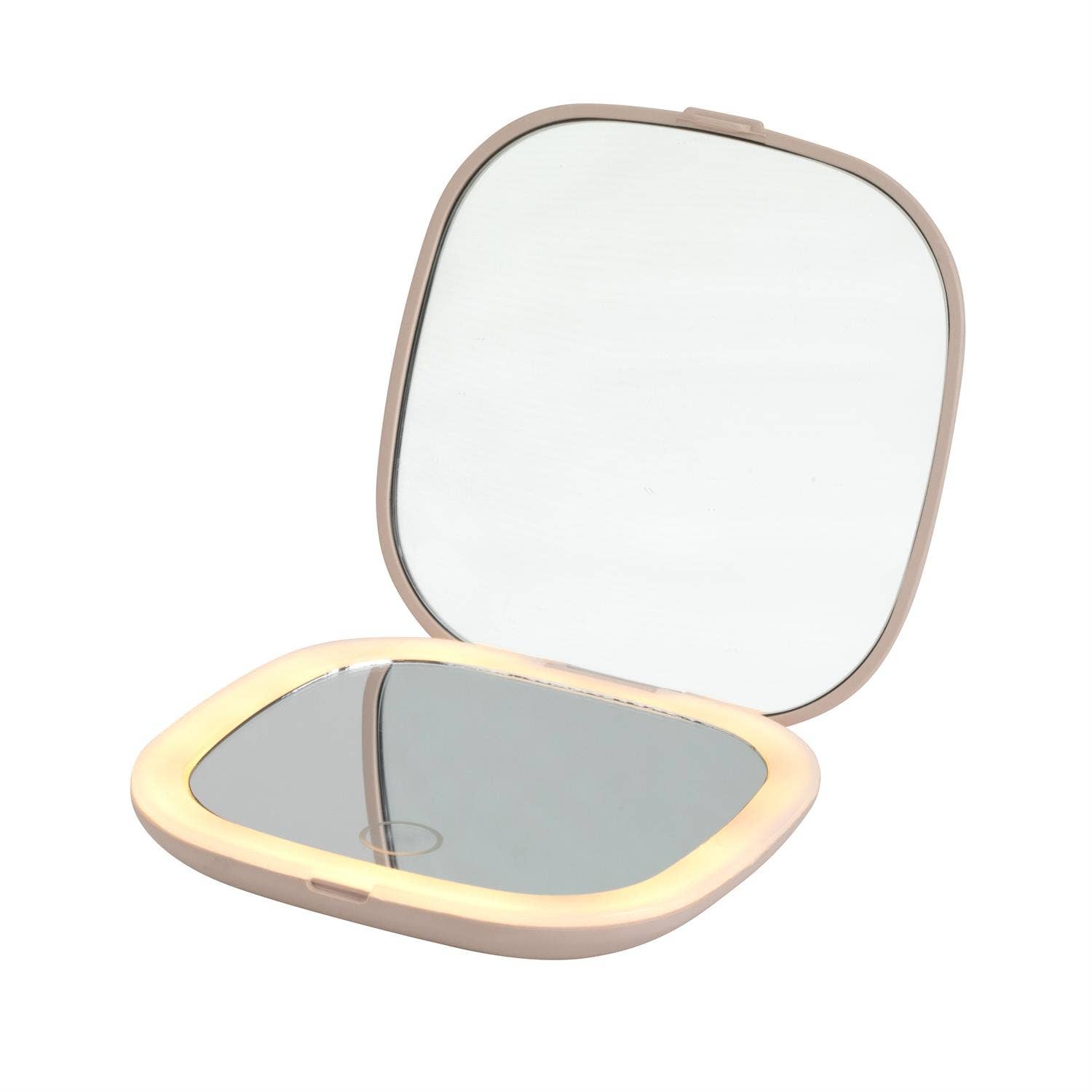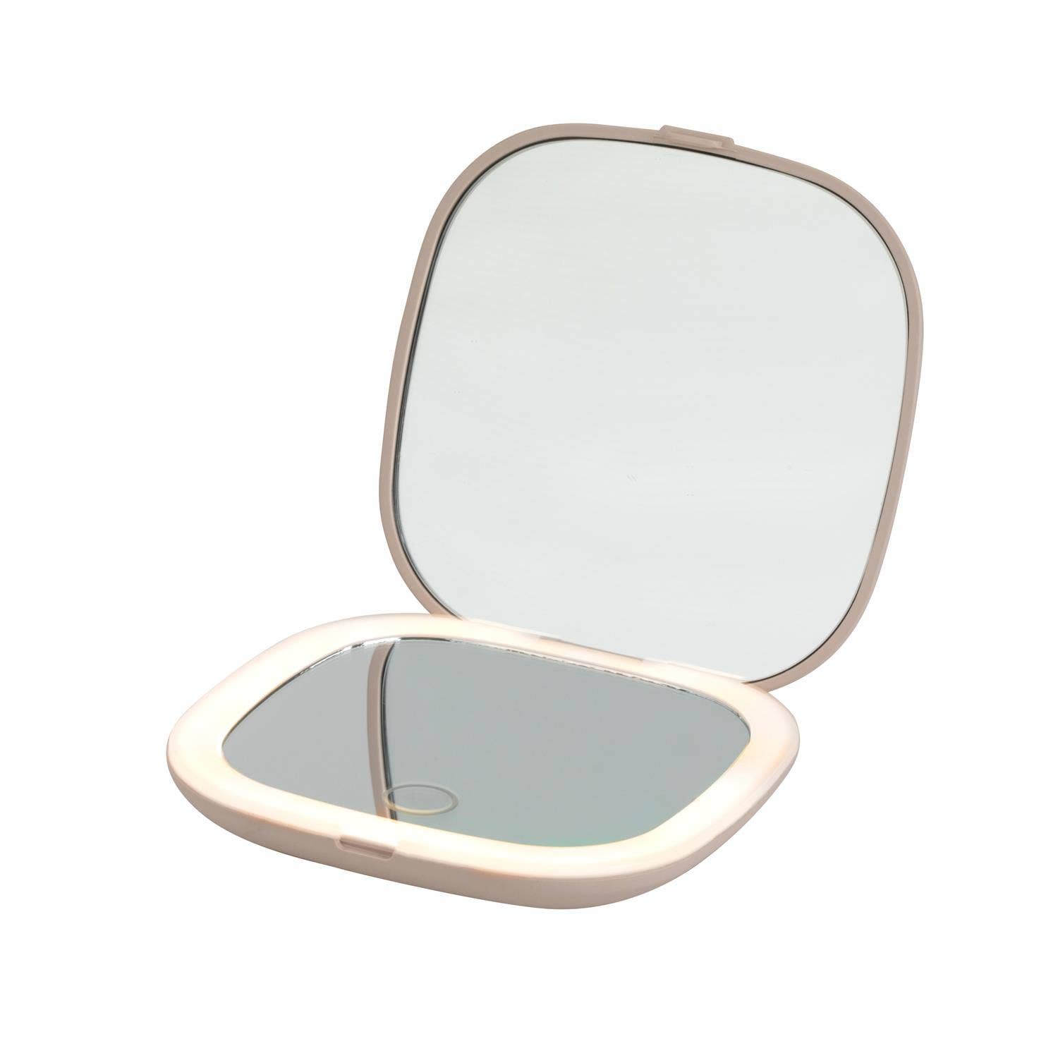 MUA þráðlaus ferðaspegill með 1,5x stækkun og ljósi, á stærð við púðurdós og passar í allar töskur. Endurhlaðanlegur USB-C tengi