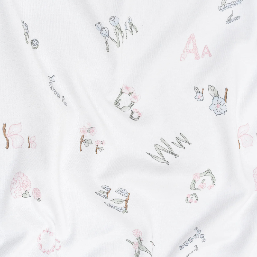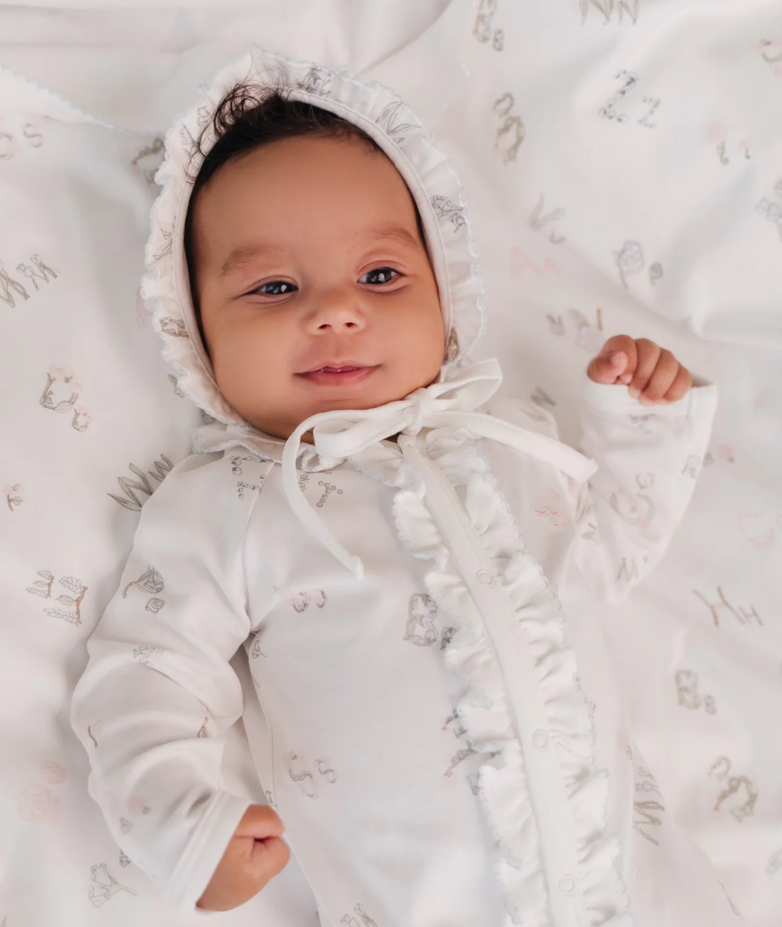 Mjúkur, hvítur heilgalli með kraga frá sænska merkinu Livly. Gallinn er skreyttur fallegu mynstri í bleikum lit. Gallinn er smelltur að framan og með áföstum sokkum. 100% pima bómull.