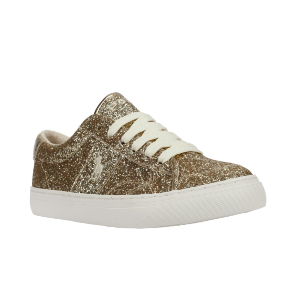Gylltir, glimmer strigaskór frá Polo Ralph Lauren. Skórnir eru reimaðir.