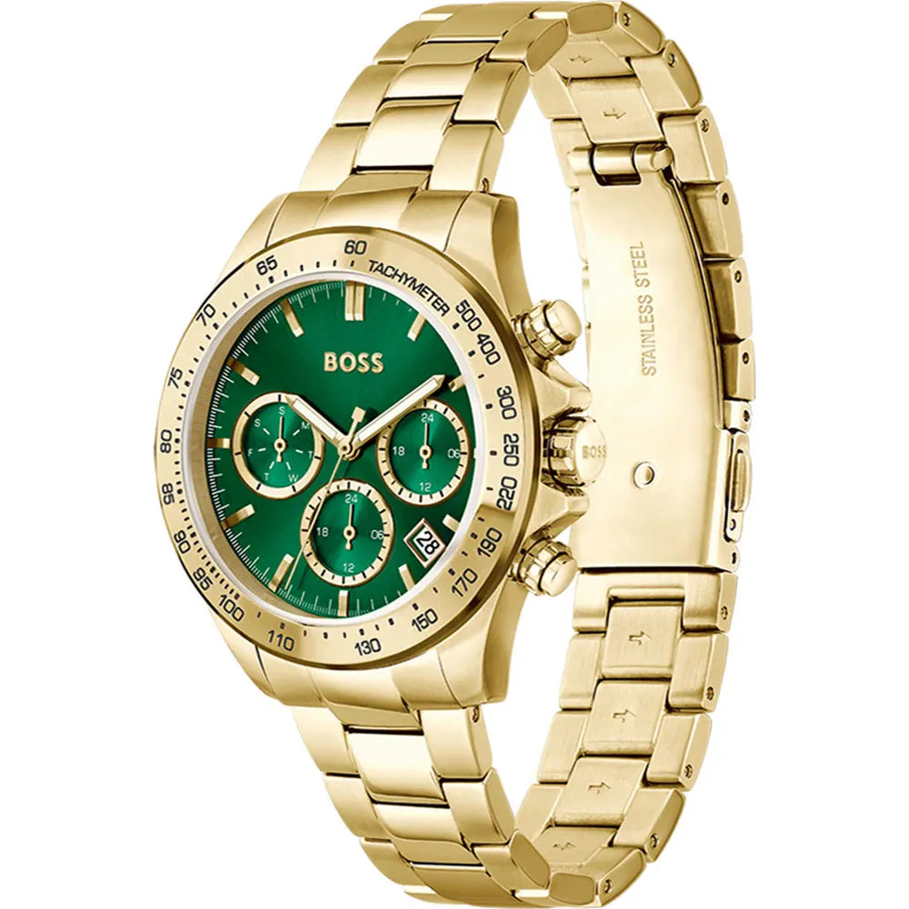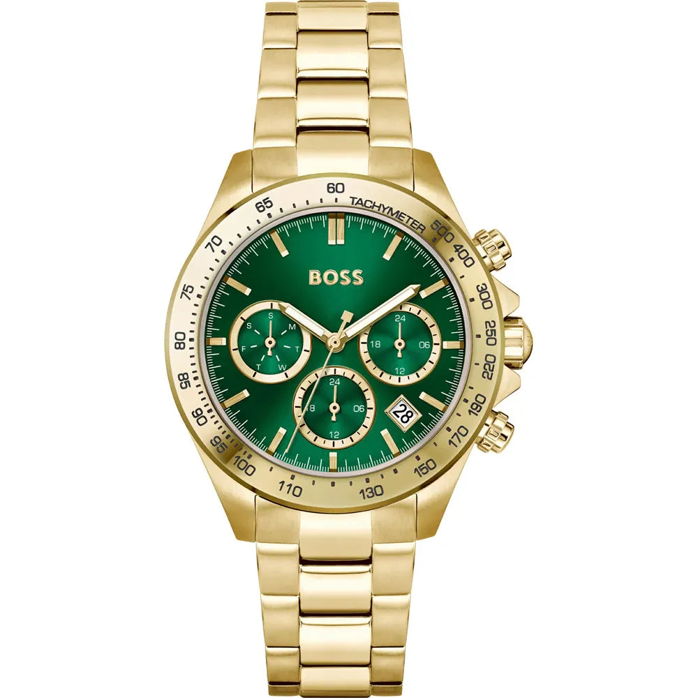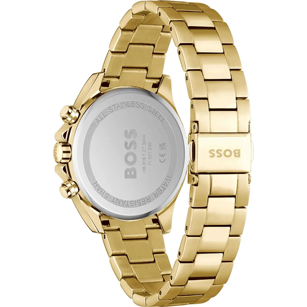 Hugo Boss Mae Vörunr: 1502750 Fallegt úr frá Hugo Boss. Gangverk:Rafhlaða/Quartz Stærð:38mm Úrkassi:Gyllt Stál Keðja/ól:Gyllt Stál Skífa:Silfurlit Gler:Hert gler Vatnsvörn:50m Dagatal:Já  ... Sjá nánar