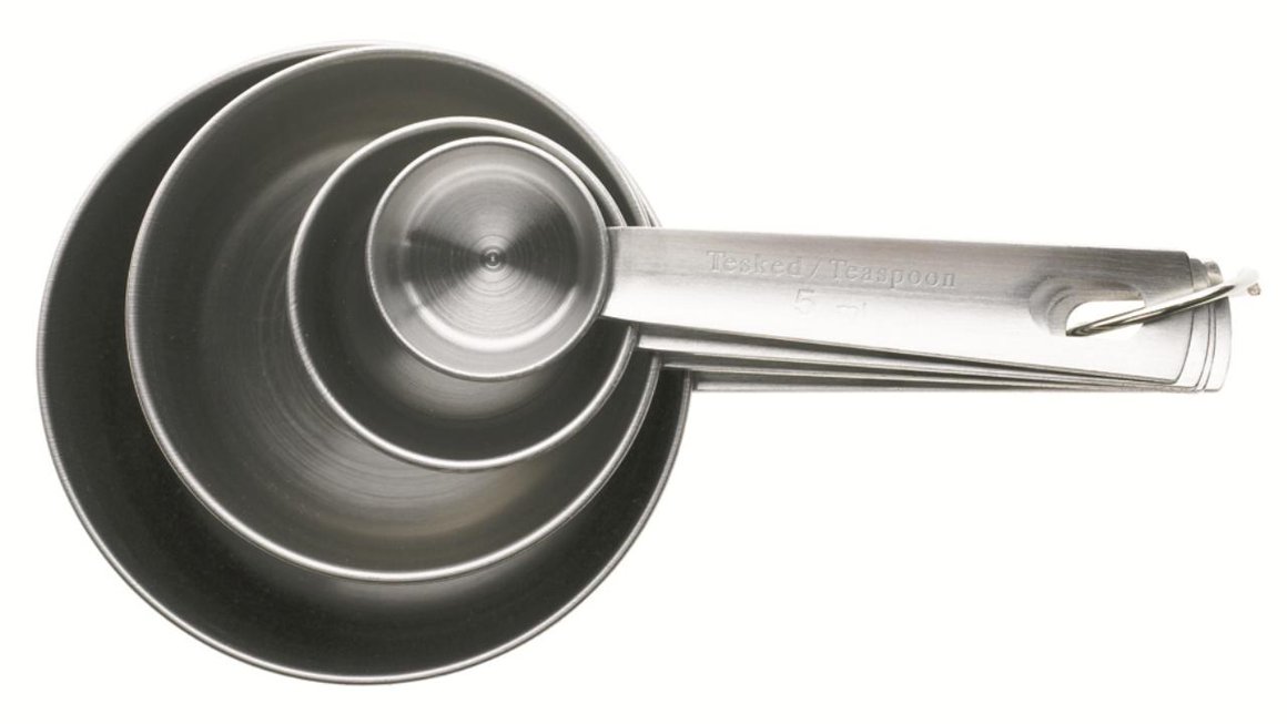 Mæliskeiðar 4 stk úr stál 1dl 1/2 dl 1 matskeið 1 teskeið Má fara í uppþvottavél.