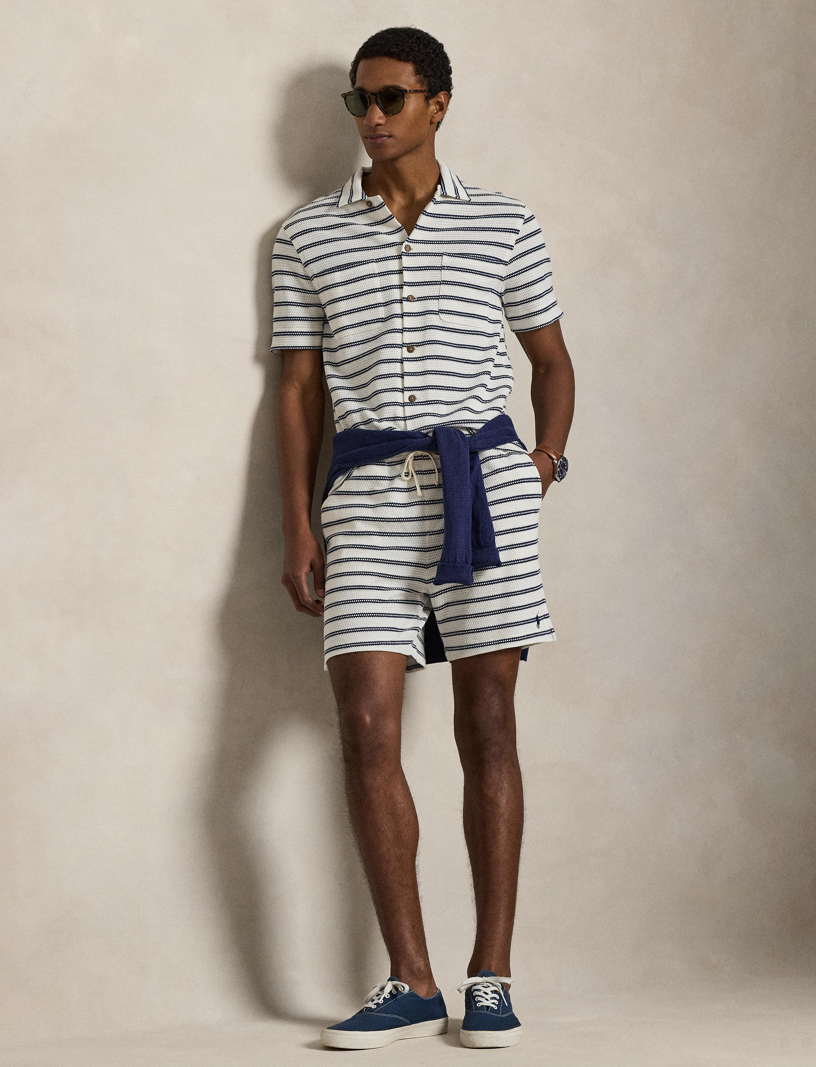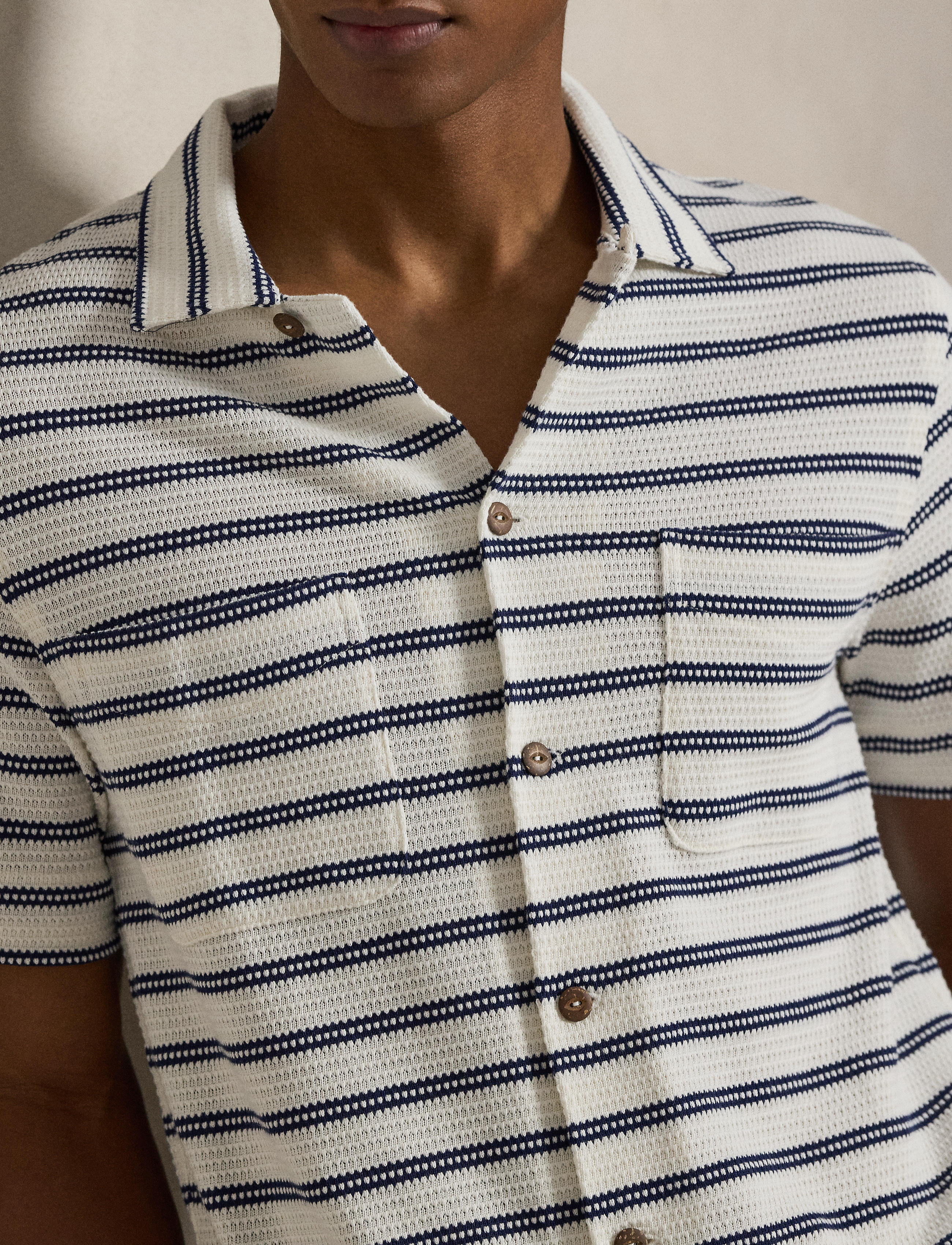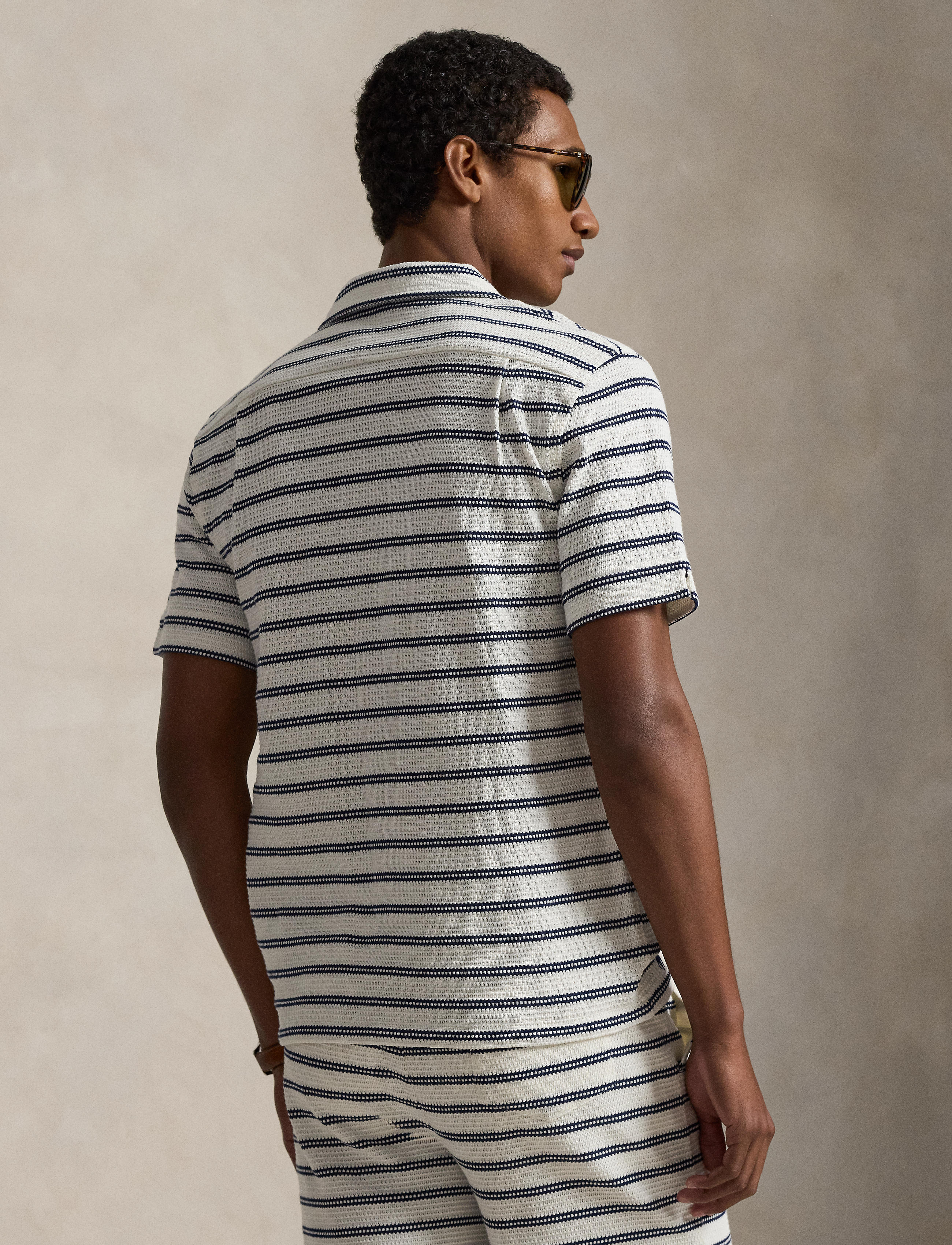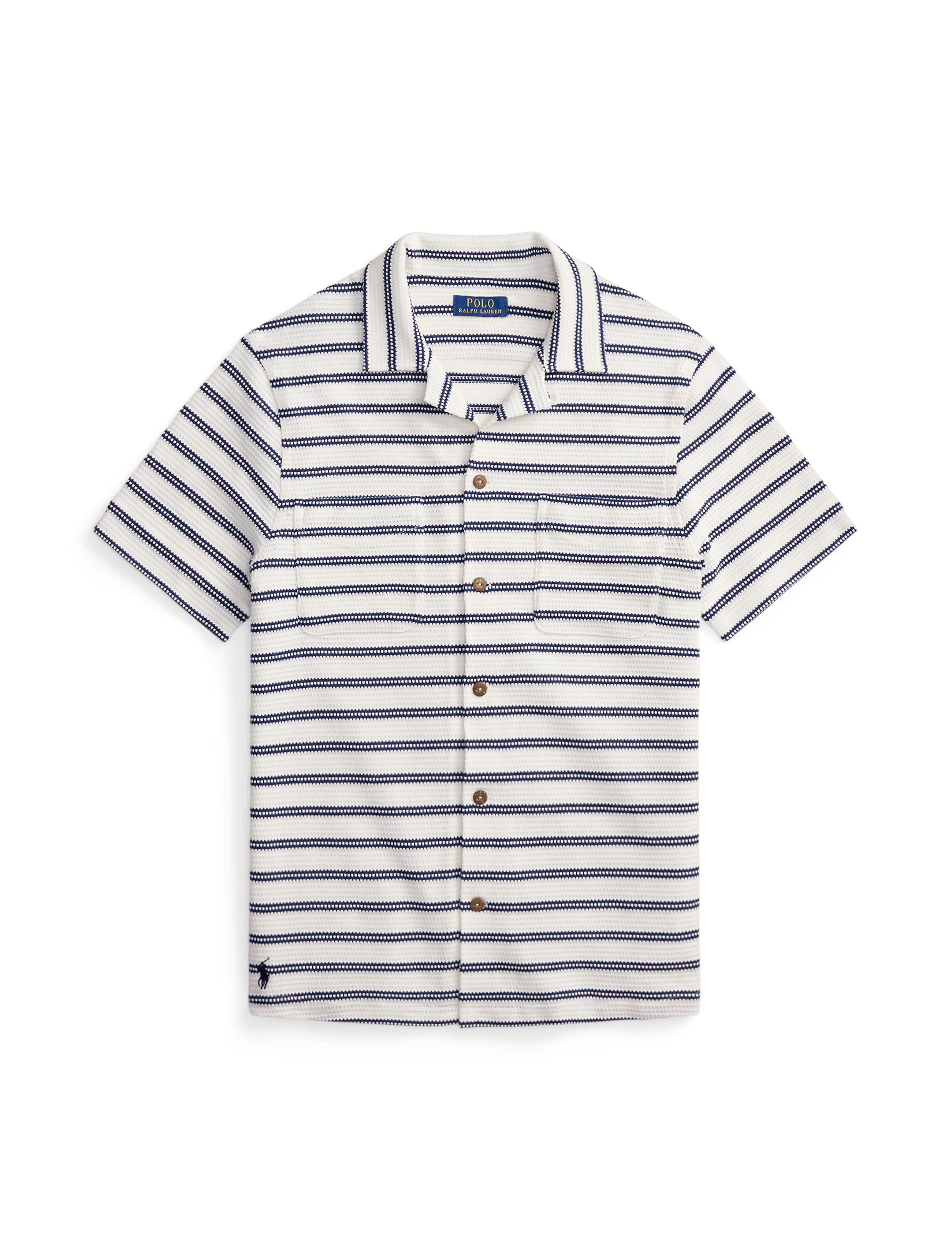 This textured camp shirt is made warm weather-ready, thanks to crisp stripes and coconut-shell buttons. Size medium has a 28" body length (front and back), a 19" shoulder, and a 42" chest. ... Sjá nánar
