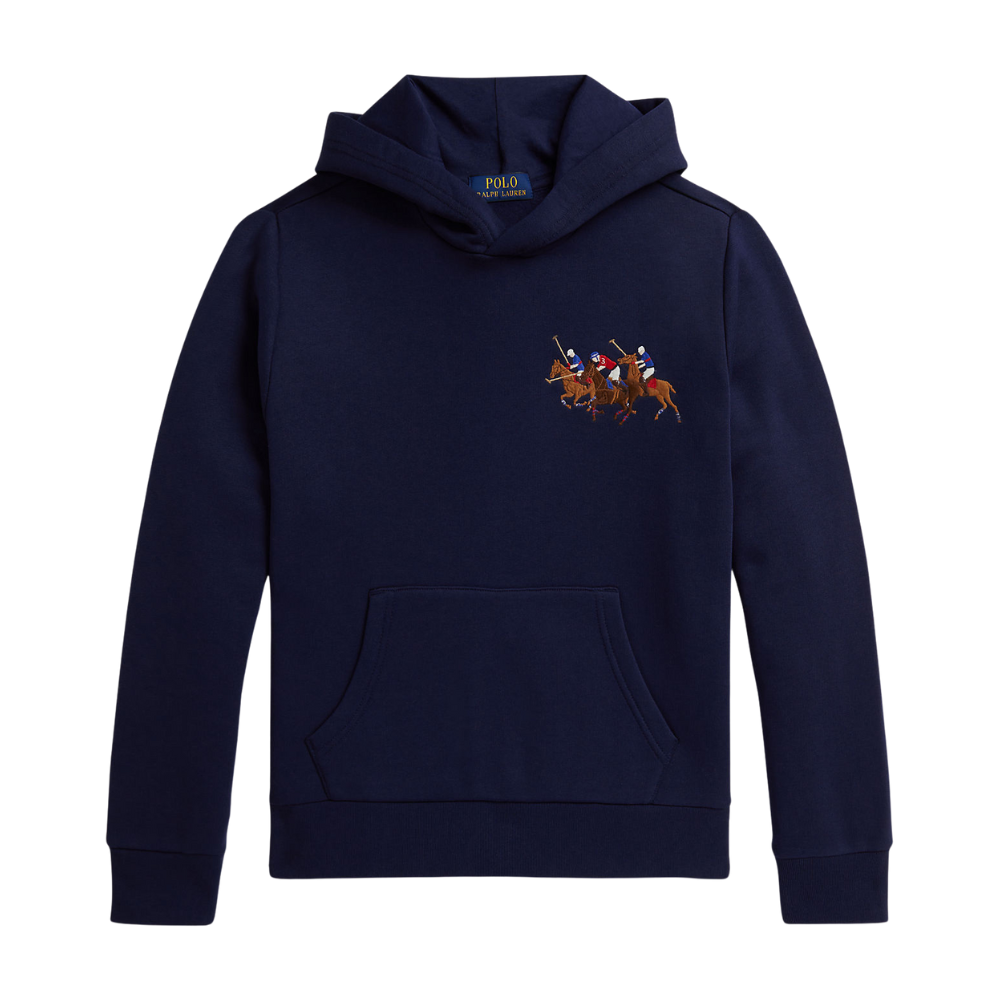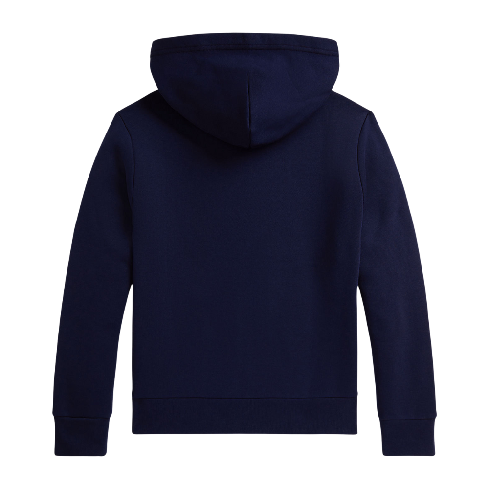 Dökk blá hettupeysa frá Polo Ralph Lauren með stóru logo að framan. Peysan er með stórum opnum vasa að framan og stroffi við ermar og mitti. 80% bómull og 20% polyester.
