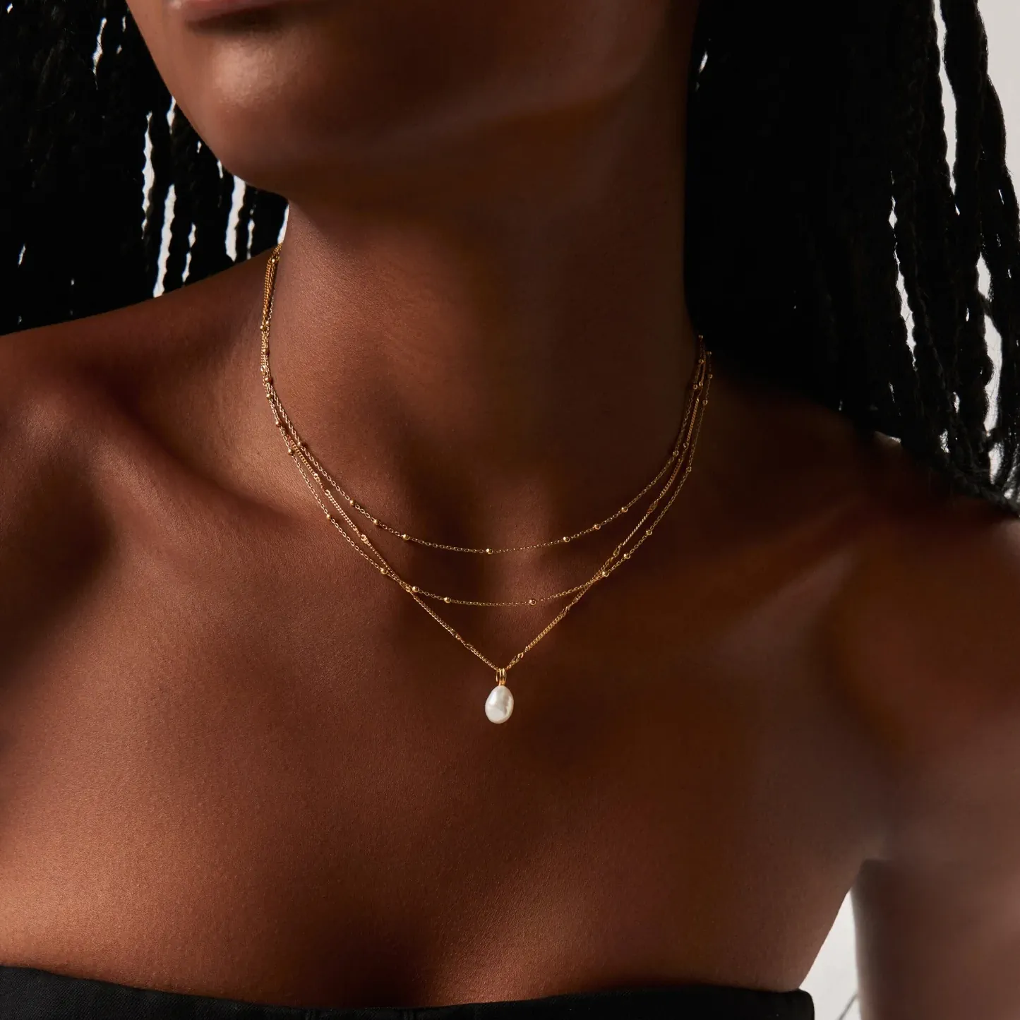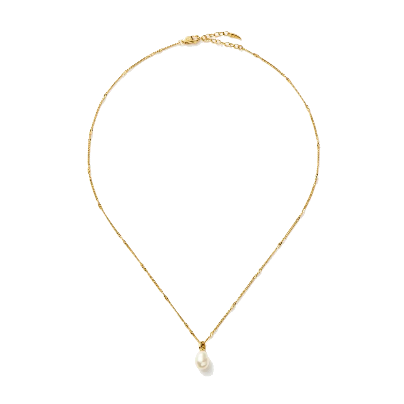 Efni hálskeðju: 18kt gullhjúpað silfur Lengd keðju: 41cm - 45cm Efni mens: 18kt gullhjúpað silfur Steinar: Perla