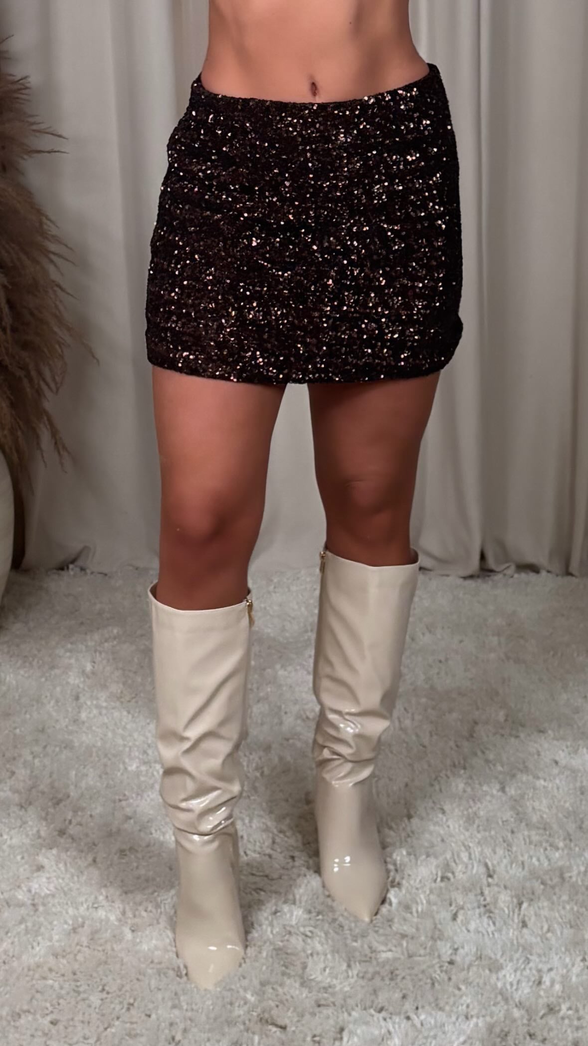 Æðislega flott pallíettu pils með rennilás a hliðinni, það er engin teygja í efninu og er með tvöfalt efni þannig að pallietturnar stinga ekki í gegn  módelið er 168cm og er í stærð S