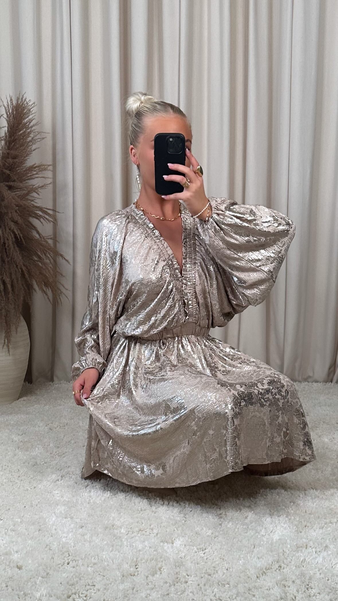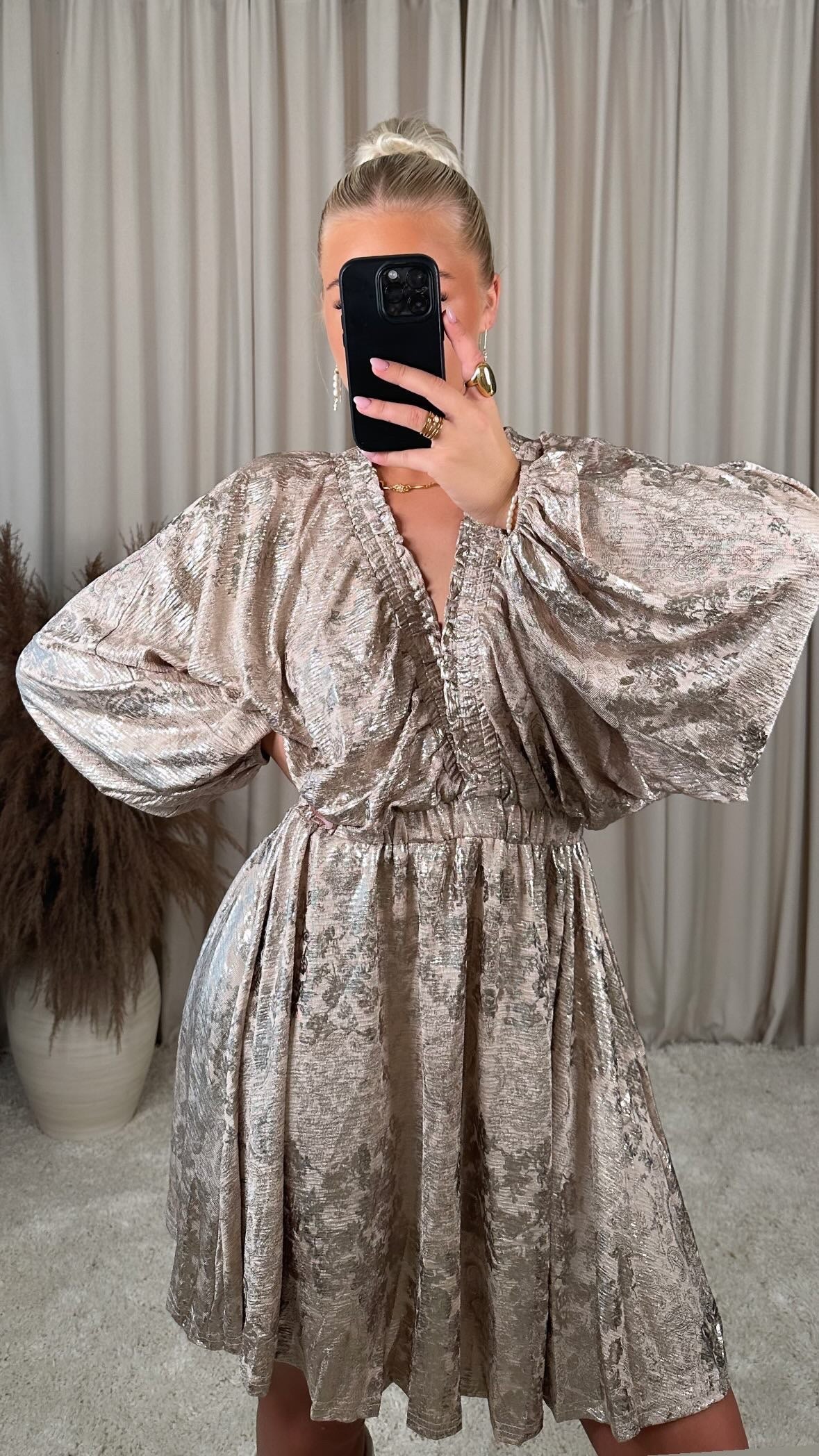 Æðislega fallegur kjóll úr mjög þæginlegu efni, það er góð teygja í efninu og með teygju í mittinu. Silfur sansering í efninu sem gerir kjólinn svo fallegan! módelið er 168cm og er í stærð S/M